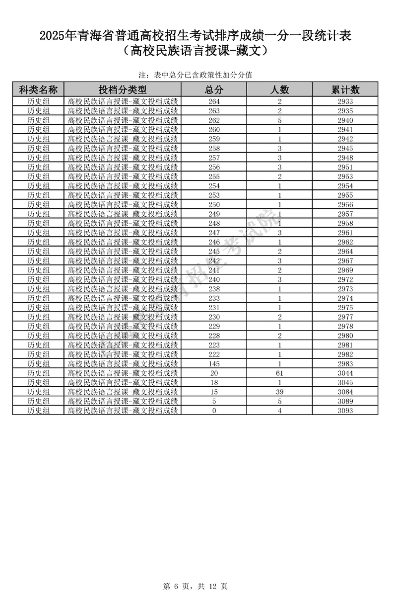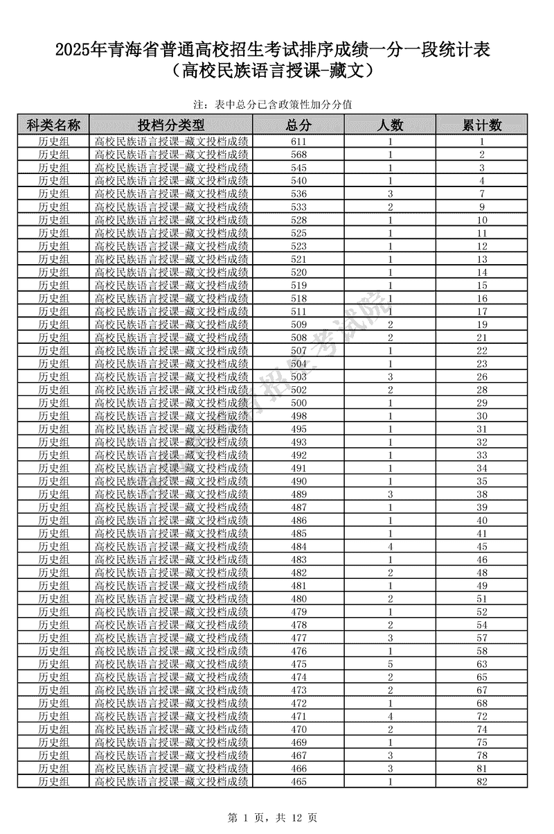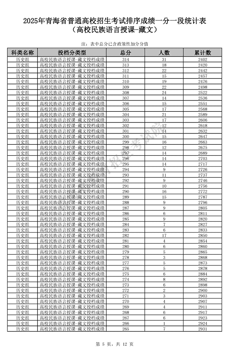 2025青海高考一分一段表最新出炉 历史类成绩分布表
