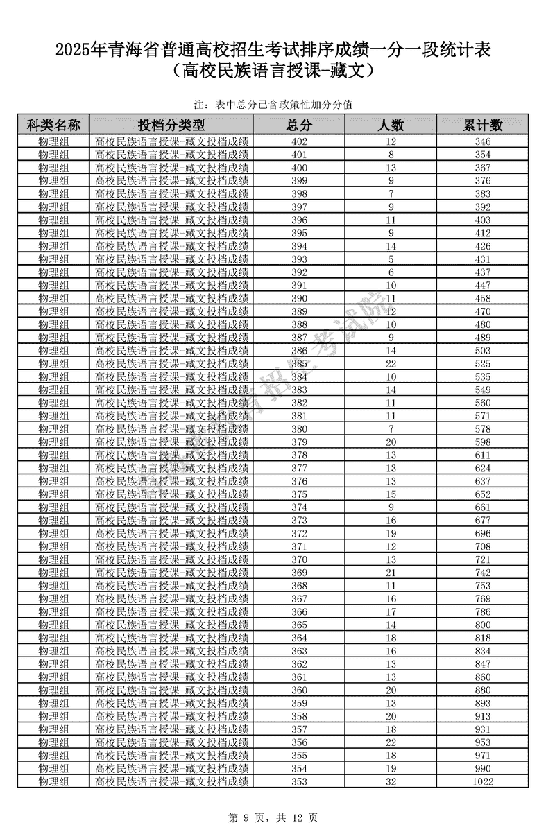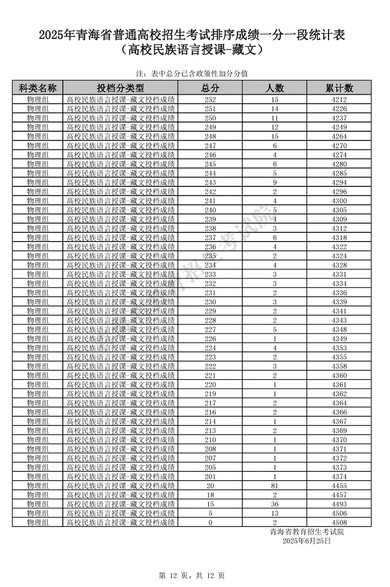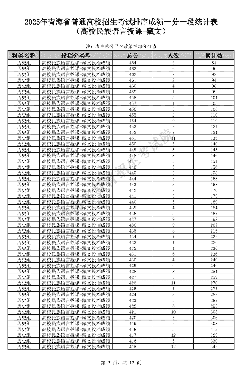 2025年青海高考排序成绩一分一段统计表(高校民族语言授课-藏文)
