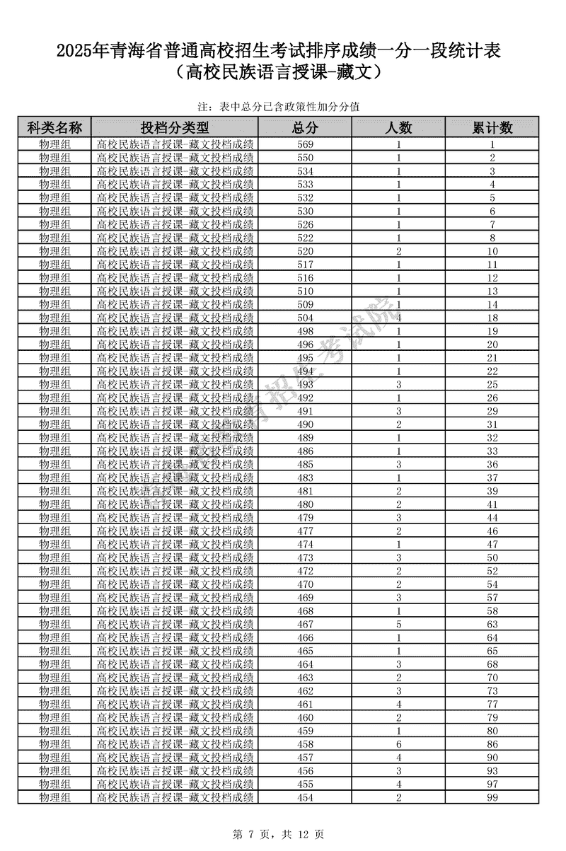 2025年青海省普通高校招生考试排序成绩一分一段统计表
