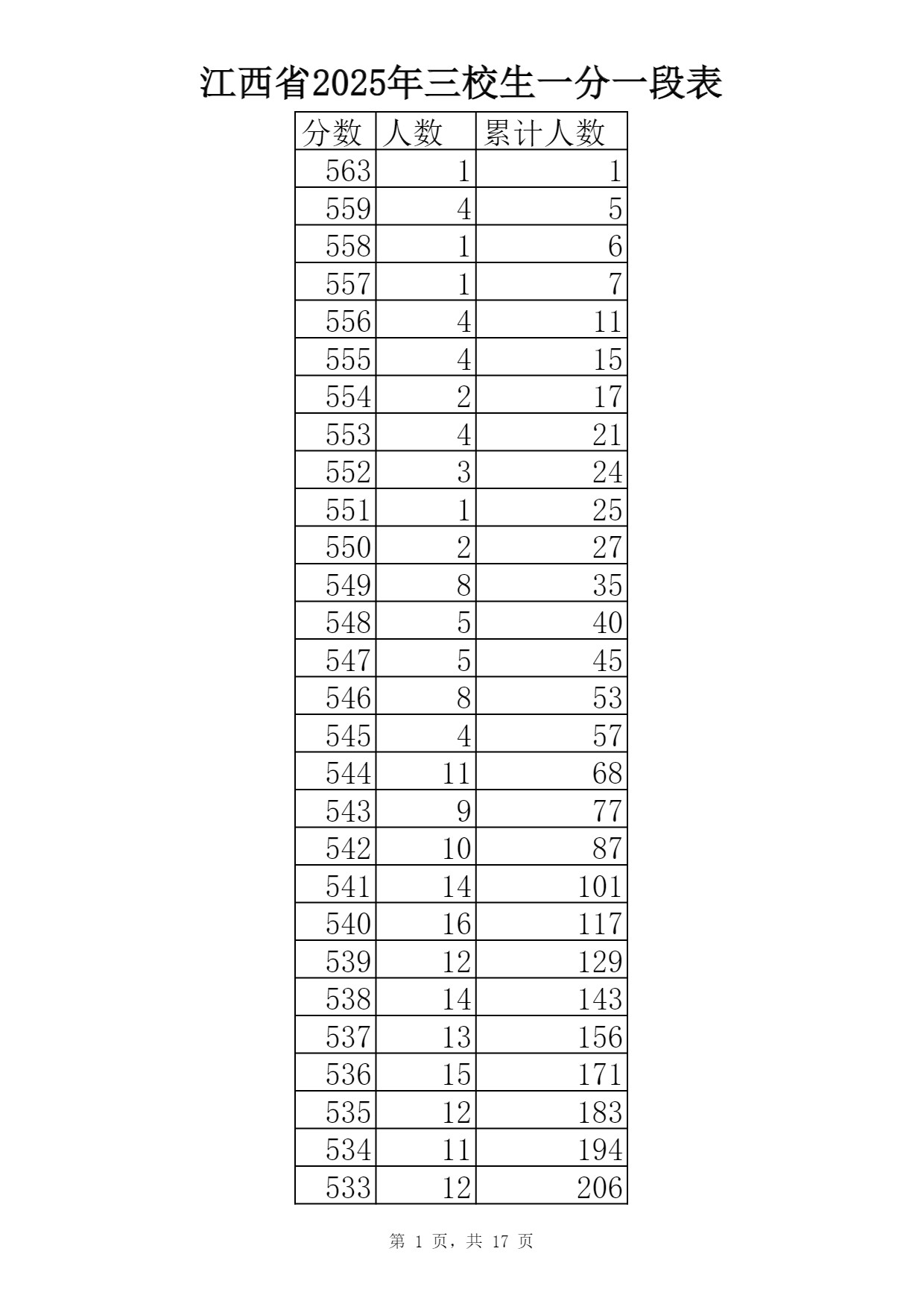 2025江西三校生一分一段表已经公布,其中563分有1人,559分有4人,558分有1人,557分有1人,556分有4人,555分有4人,554分有2人,553分有4人,552分有3人,551分有1人,550分有2人,具体排名及位次如下。