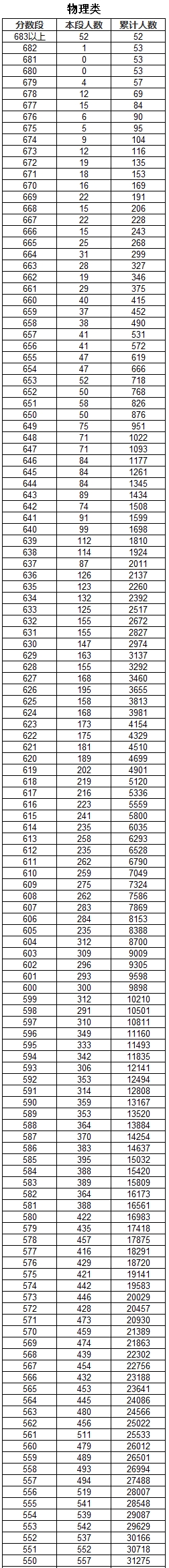 2025云南省高考物理类一分一段表已经公布,其中683分及以上累计人数是52人;650分累计人数是876人;620分累计人数是4699人;600分累计人数是9898人;550分累计人数是31275人。以下是小编整理的详细内容,大家可以看一看。