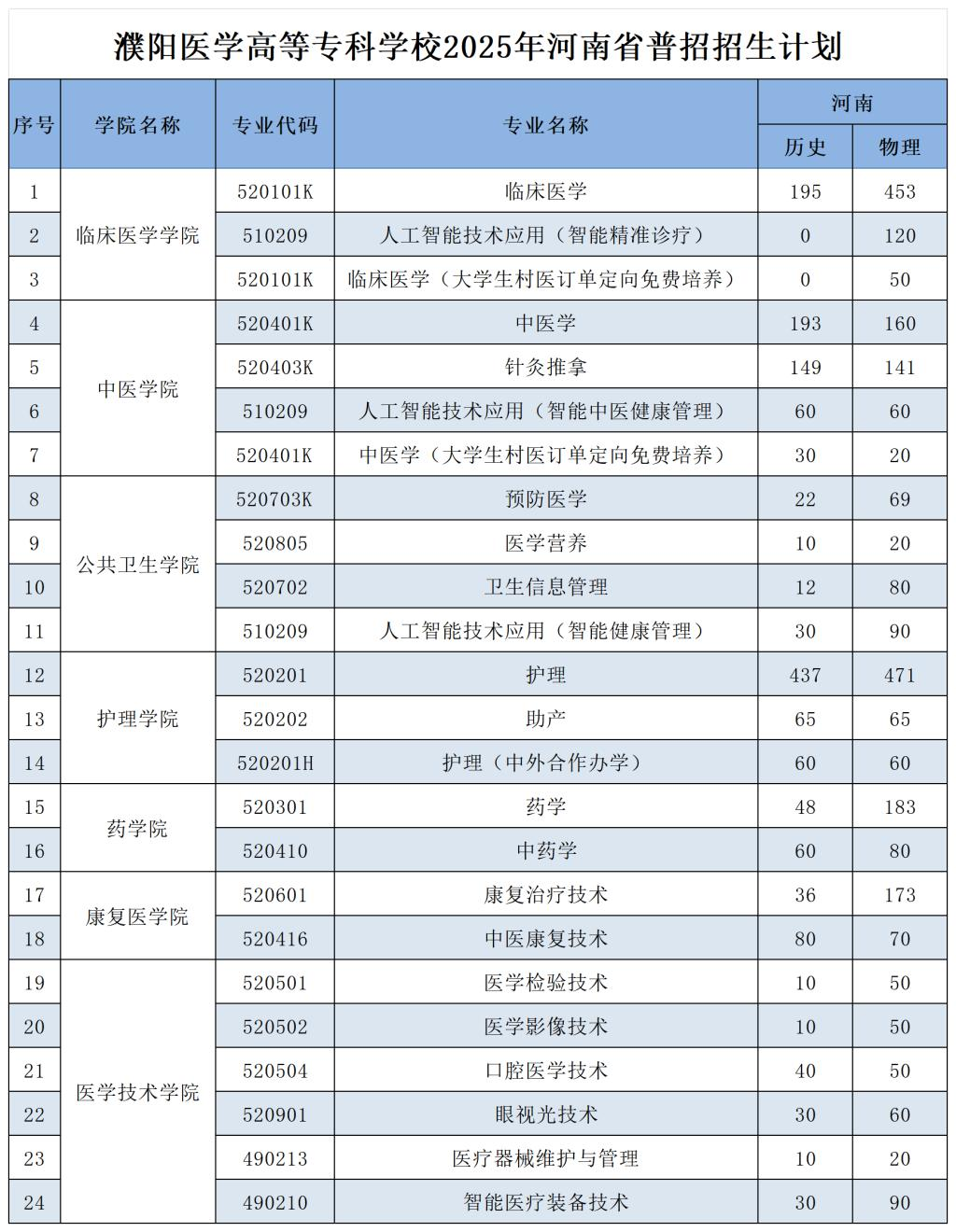 2025濮阳医学高等专科学校招生计划及各专业招生人数