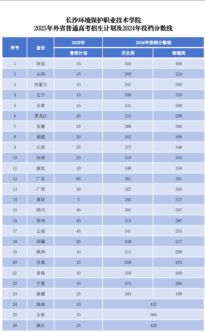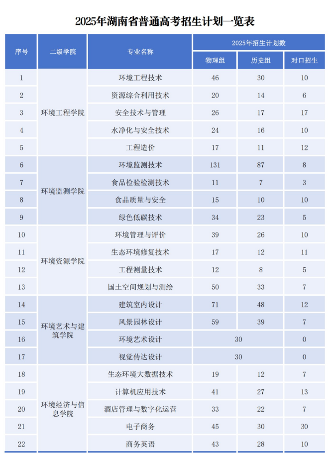 本文为大家整理的是长沙环境保护职业技术学院2025年招生计划,主要包含招生专业、招生类别、各专业招生人数等信息,希望对大家有所帮助,如有变动或异议,请以各省市教育考试院或学校公布的信息为准。