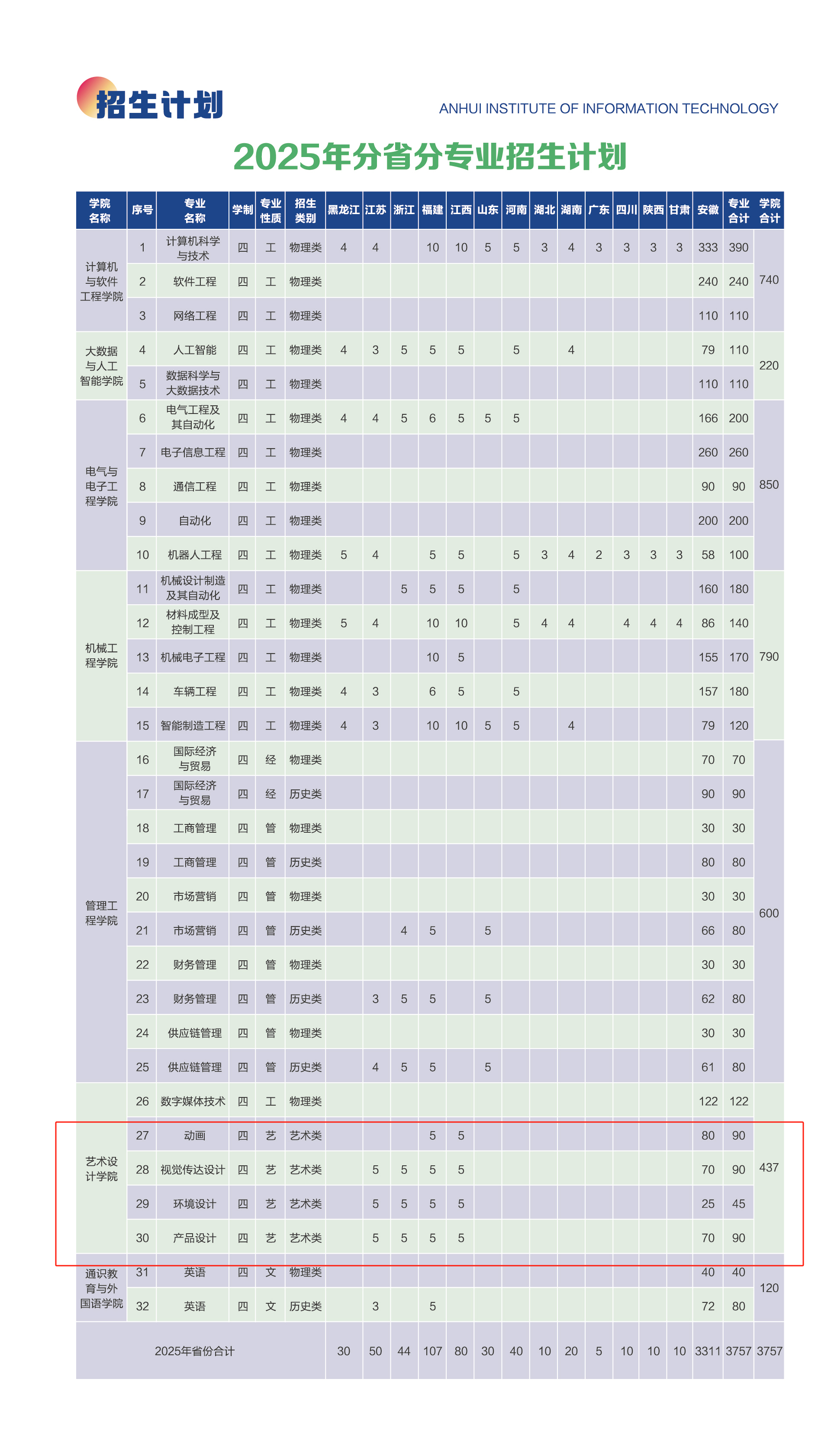 本文为大家整理的是安徽信息工程学院2025年艺术类招生计划,主要包含招生专业、各专业招生人数等信息,希望对大家有所帮助,如有变动或异议,请以各省市教育考试院或学校公布的信息为准。