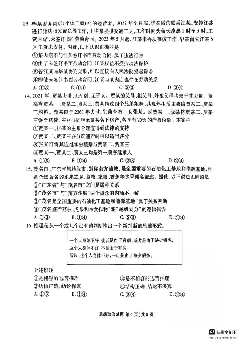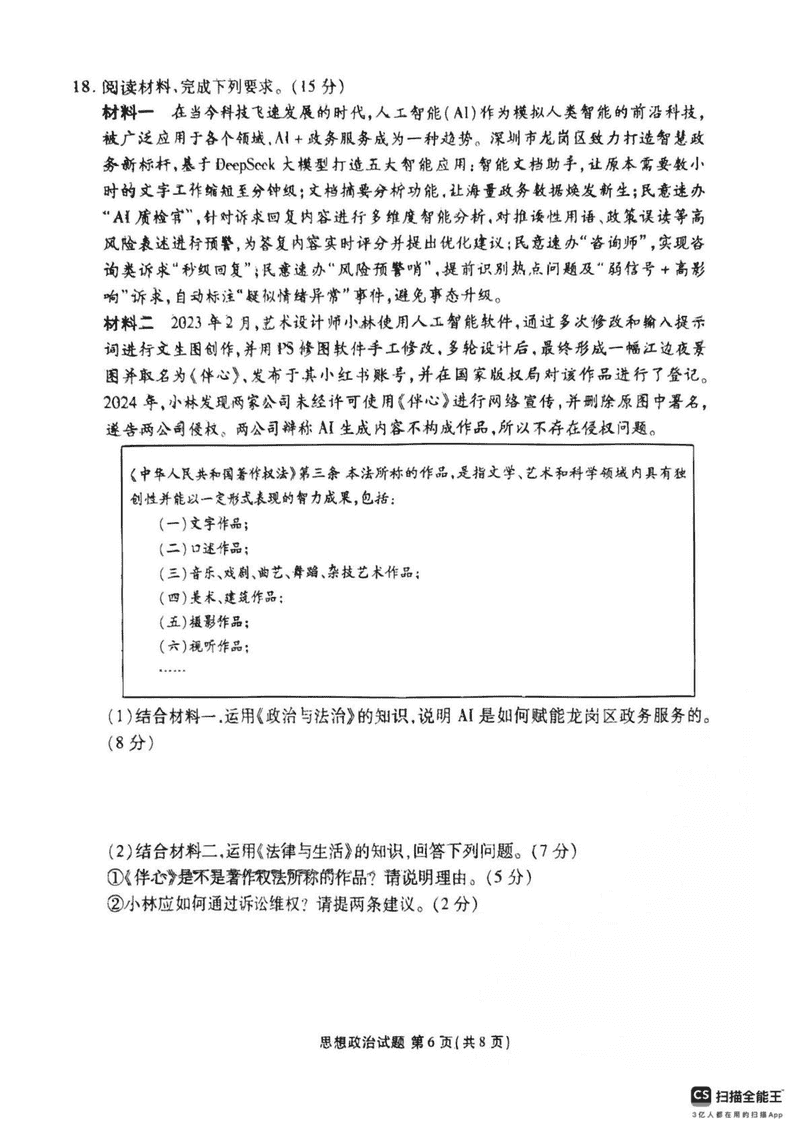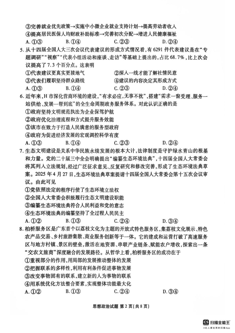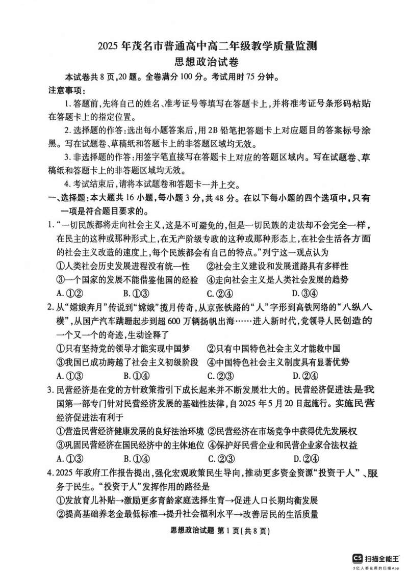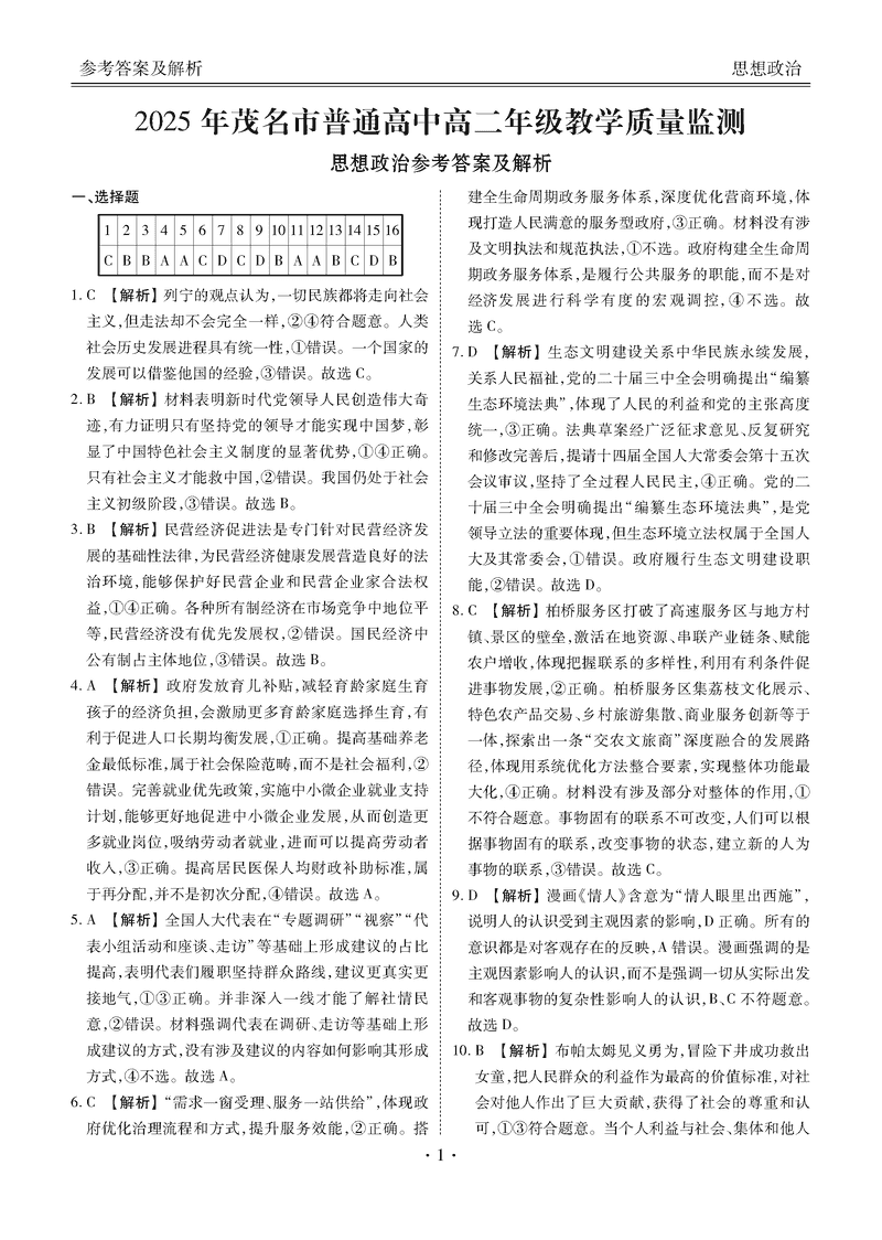 广东茂名2025年高二下学期期末教学质量监测政治试题及答案 时间:2025-07-08 广东 高中政治 广东省茂名市2024-2025学年高二下学期期末教学质量监测政治考试已于近日开考,为方便考生考后及时查看考试情况,查漏补缺、弥补不足,本文整理了试题答案解析相关信息! 政治试题及答案解析