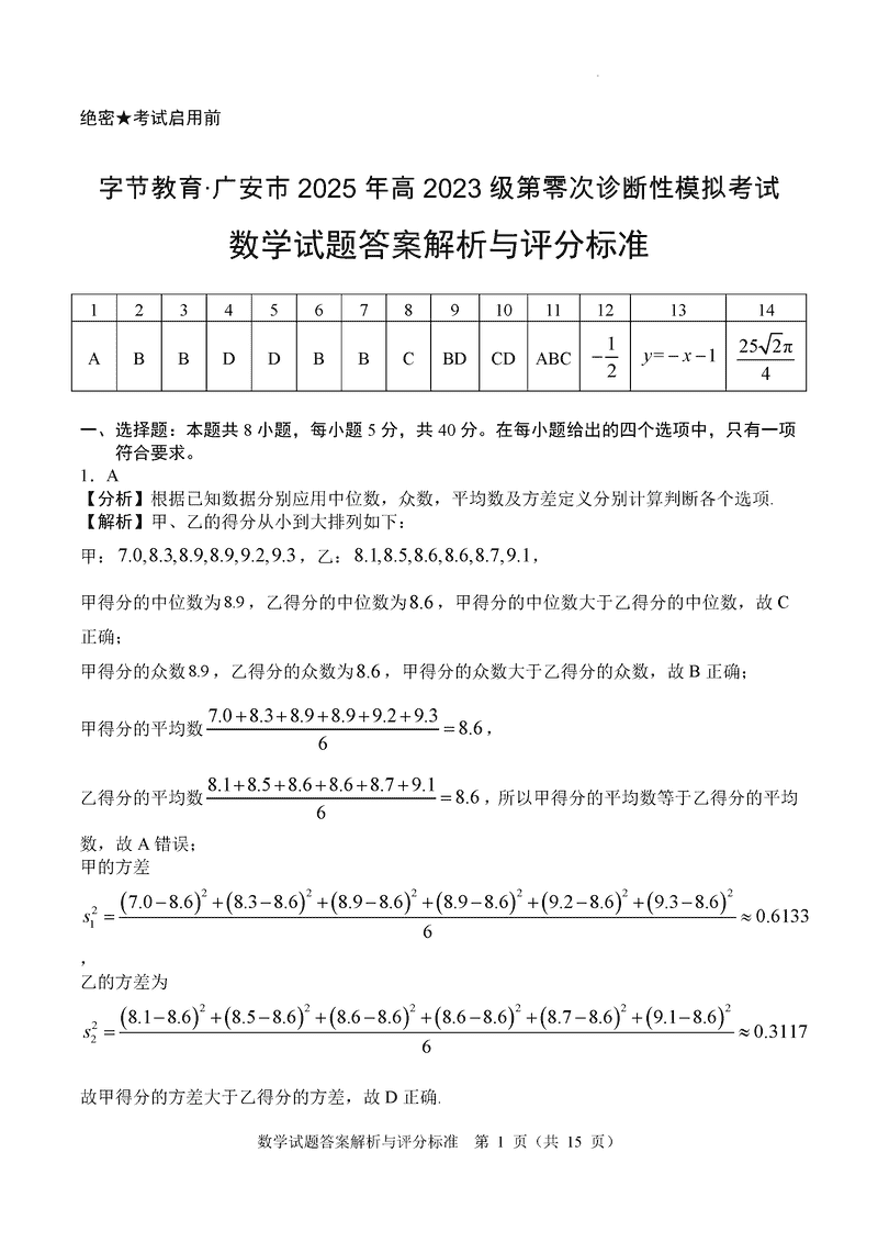 字节教育(广安、雅安、简阳市)2025年2023级零诊模拟数学试题及答案