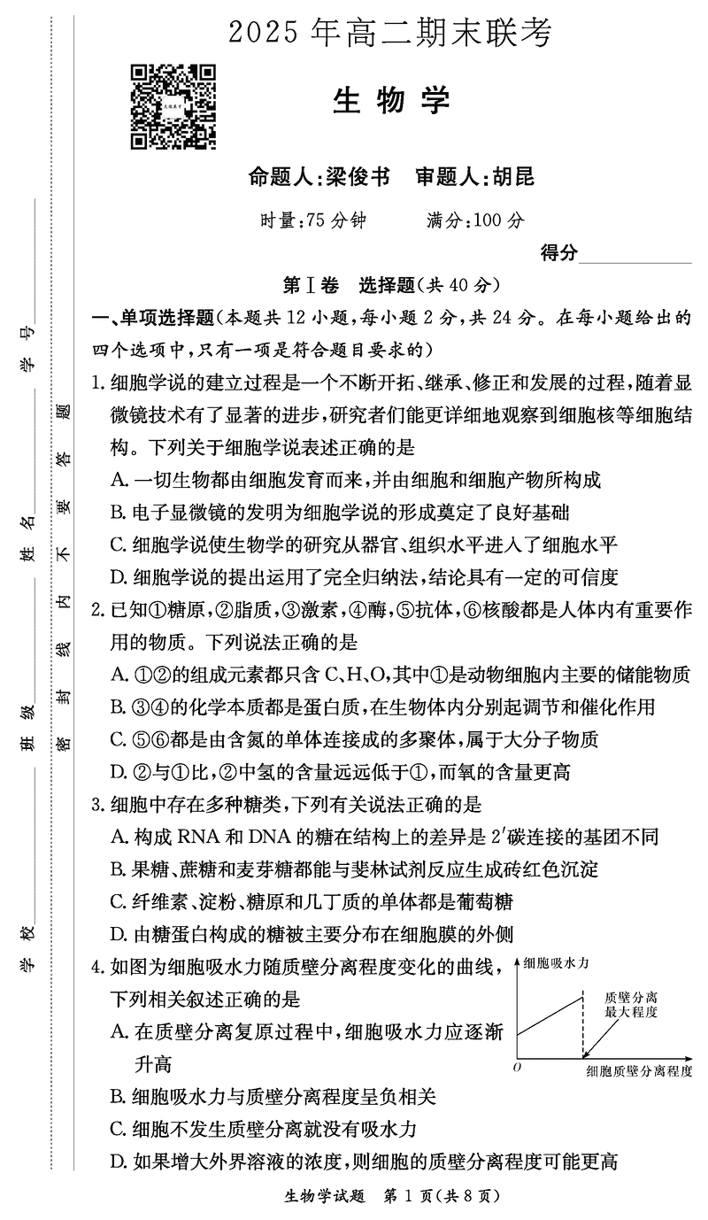 湖南新高考教学教研联盟暨长郡二十校联盟2025年高二年级下学期期末联考生物考试已于近日开考,为方便考生考后及时查看考试情况,查漏补缺、弥补不足,本文整理了试题答案解析相关信息!