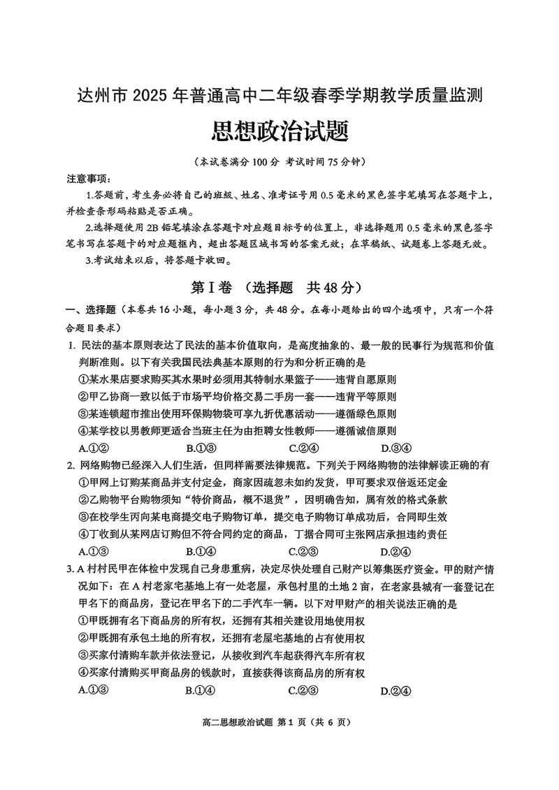 四川达州2025年高二春季教学质量监测政治试题及答案 时间:2025-07-08 四川 高中政治 四川省达州市2025年普通高二年级春季学期教学质量监测政治考试已于近日开考,为方便考生考后及时查看考试情况,查漏补缺、弥补不足,本文整理了试题答案解析相关信息! 政治试题及答案解析