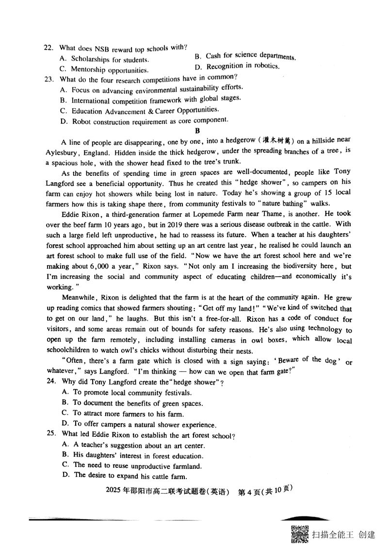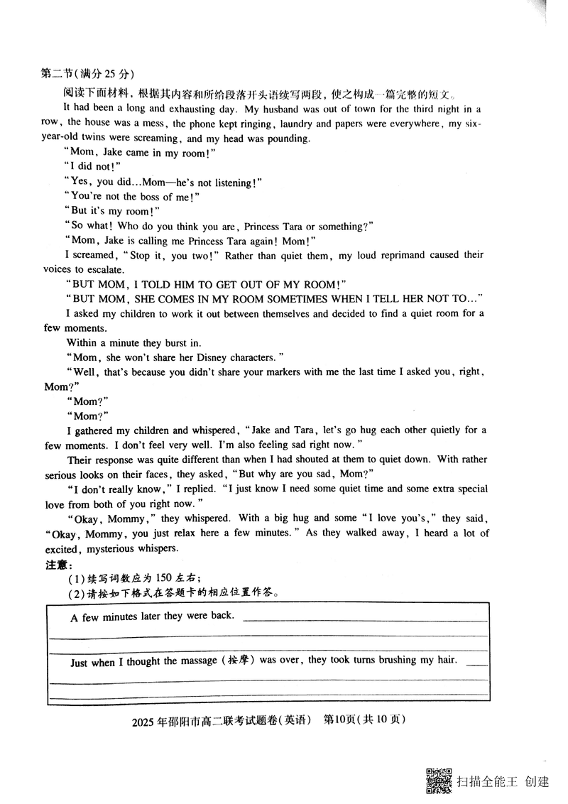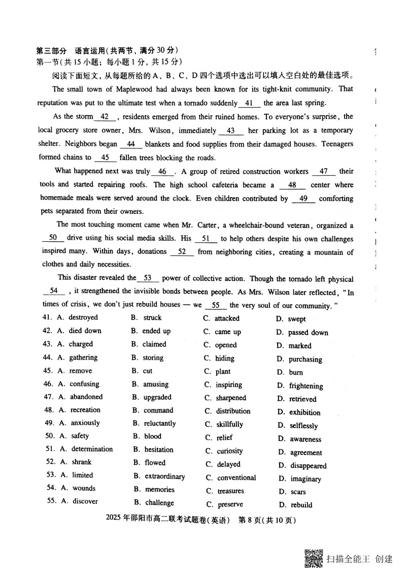 湖南邵阳2025年高二7月期末联考英语试题及答案 时间:2025-07-08 湖南 高中英语 湖南省邵阳市2025年高二下学期7月期末联考英语考试已于近日开考,为方便考生考后及时查看考试情况,查漏补缺、弥补不足,本文整理了试题答案解析相关信息! 英语试题及答案解析