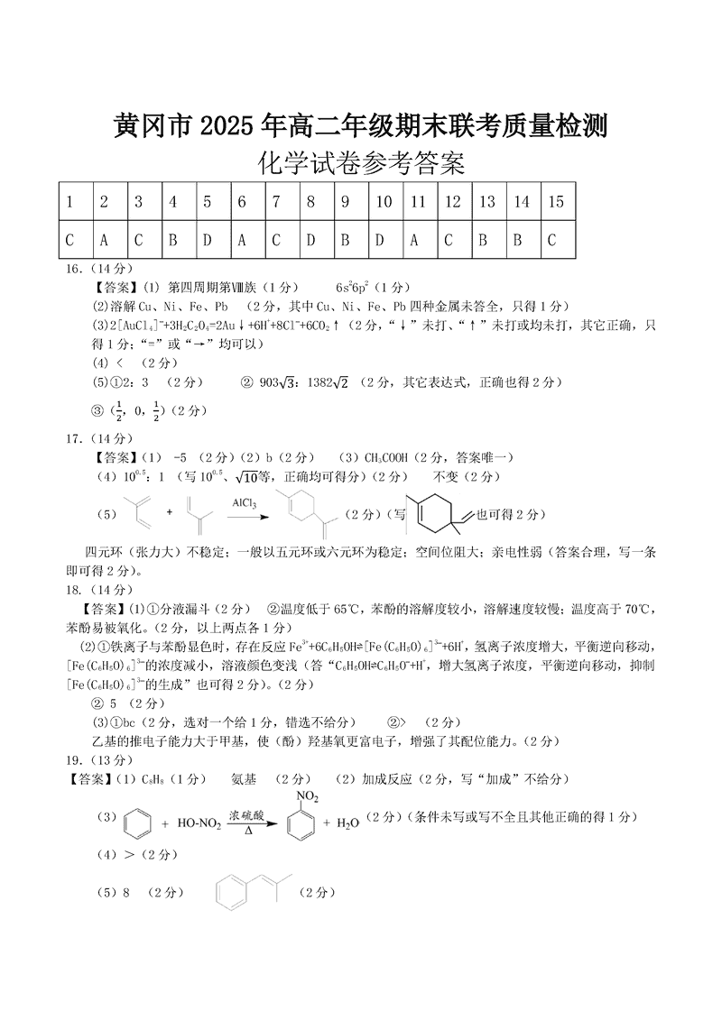 黄冈市2025年高二下学期期末化学试题及答案 时间:2025-07-08 湖北 高中化学 湖北省黄冈市2024-2025学年高二下学期期末质量监测化学考试已于近日开考,为方便考生考后及时查看考试情况,查漏补缺、弥补不足,本文整理了试题答案解析相关信息! 化学试题及答案解析