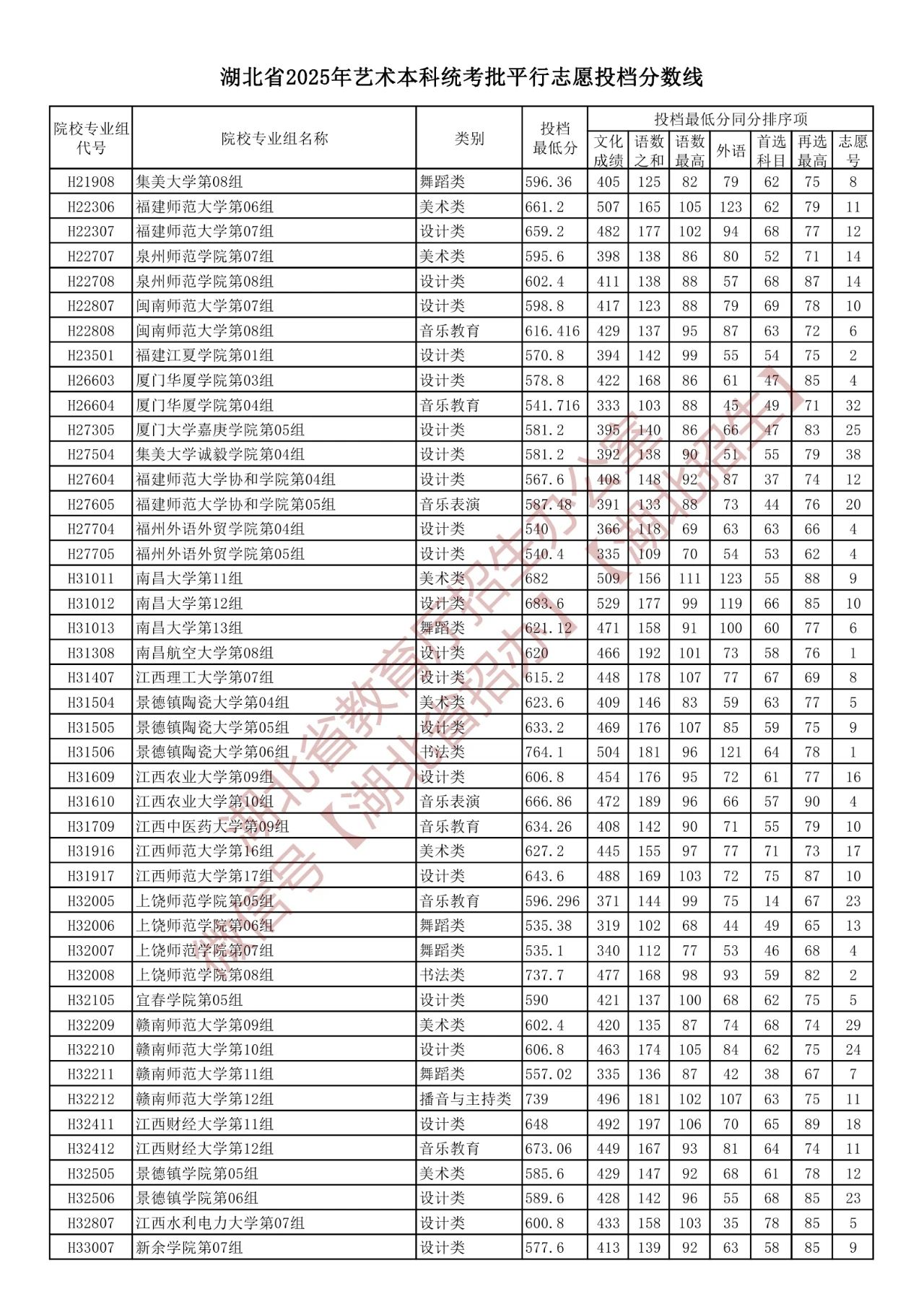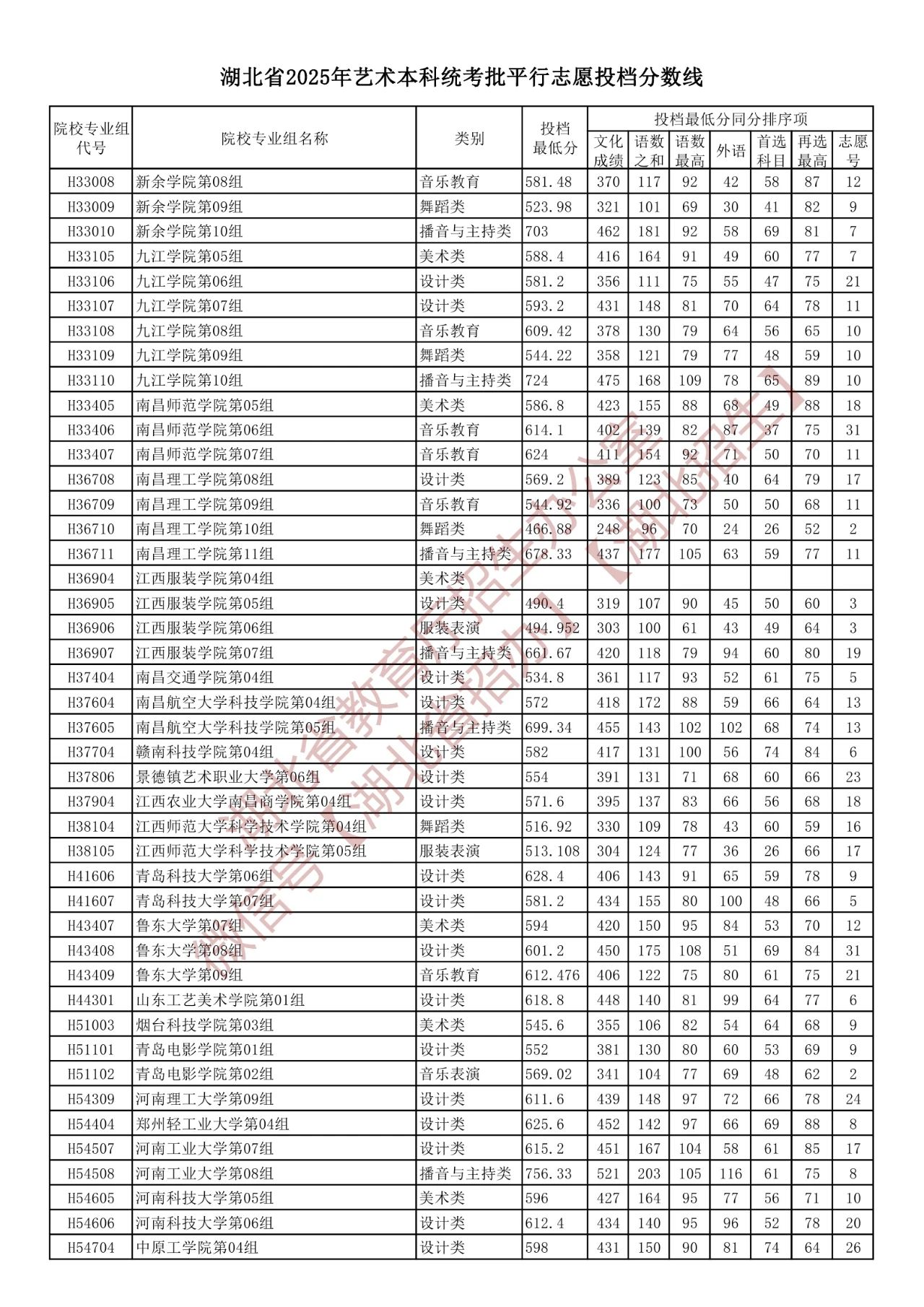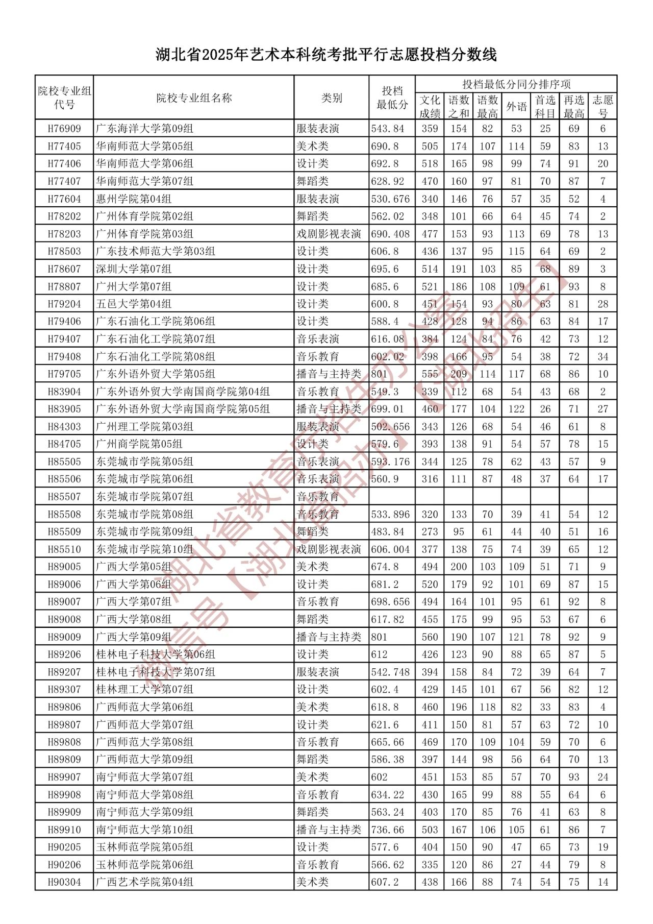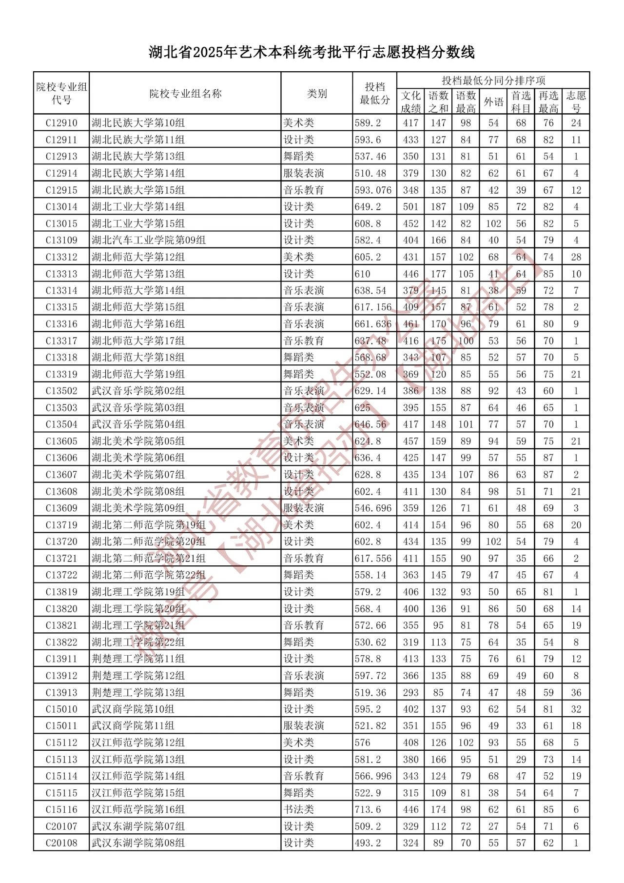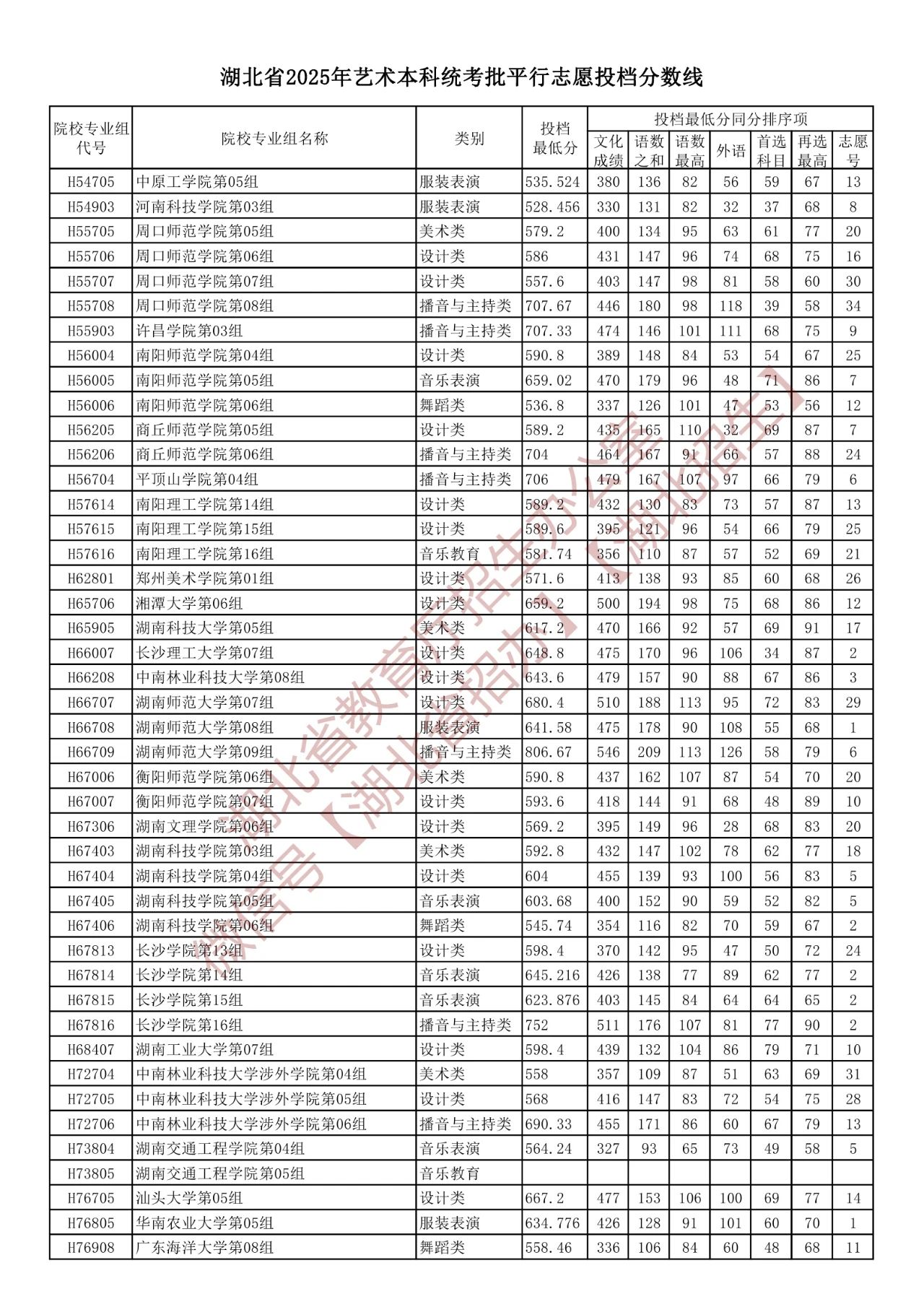 湖北省2025年艺术本科统考批平行志愿投档分数线
