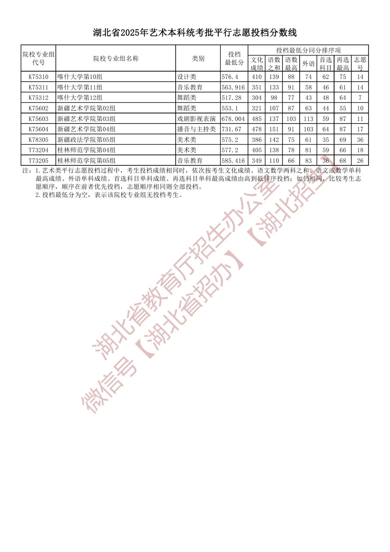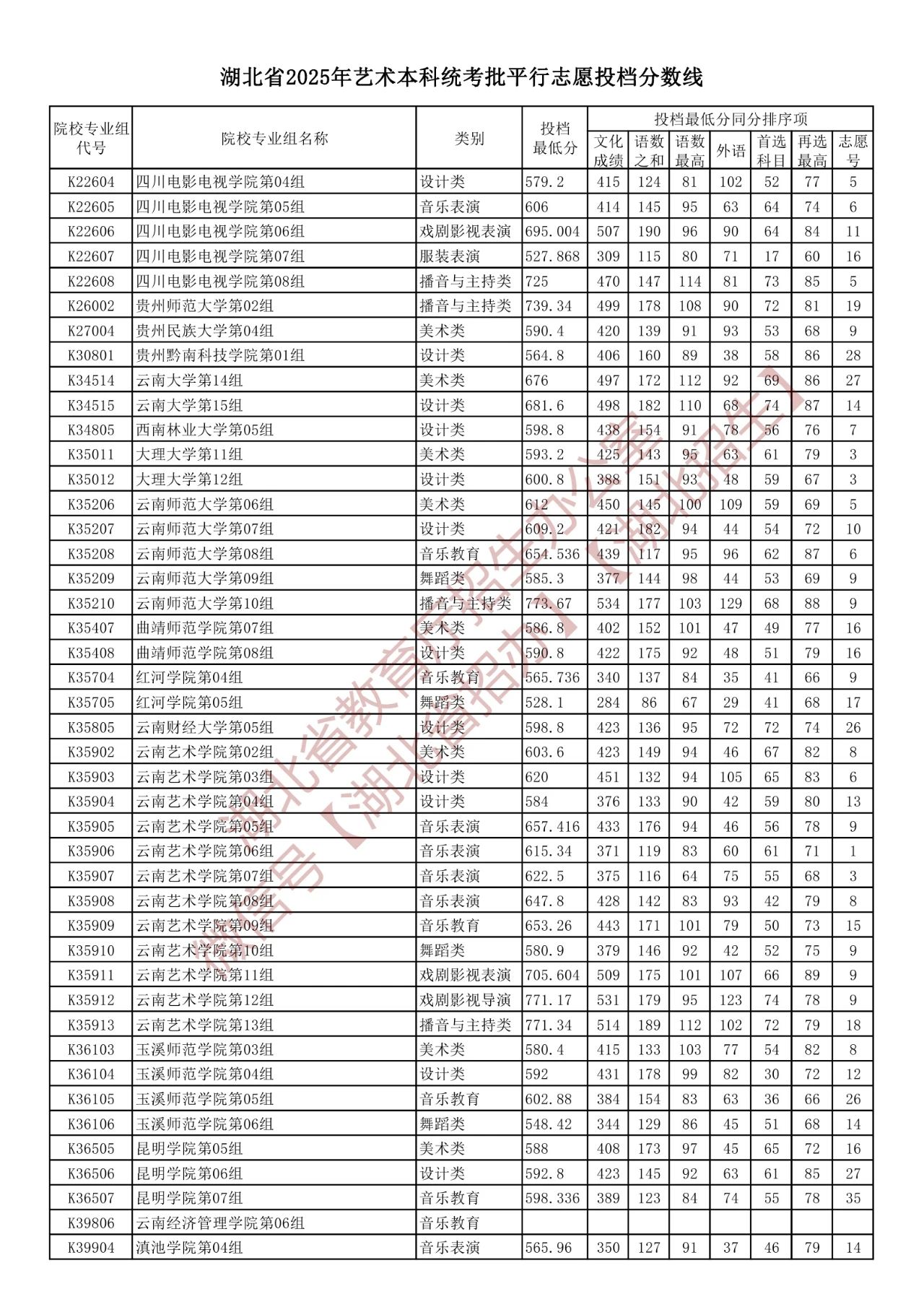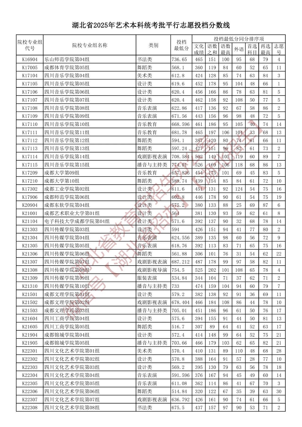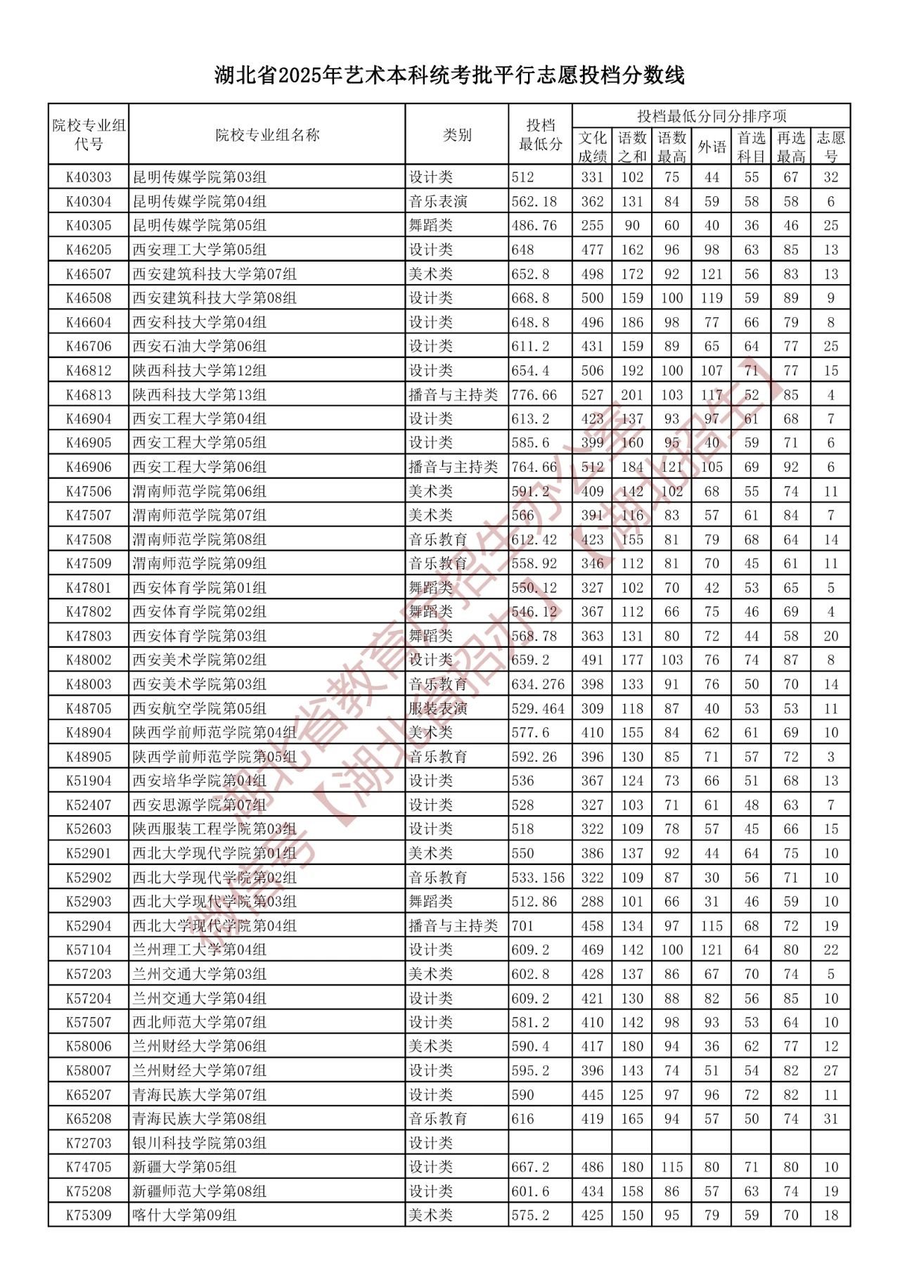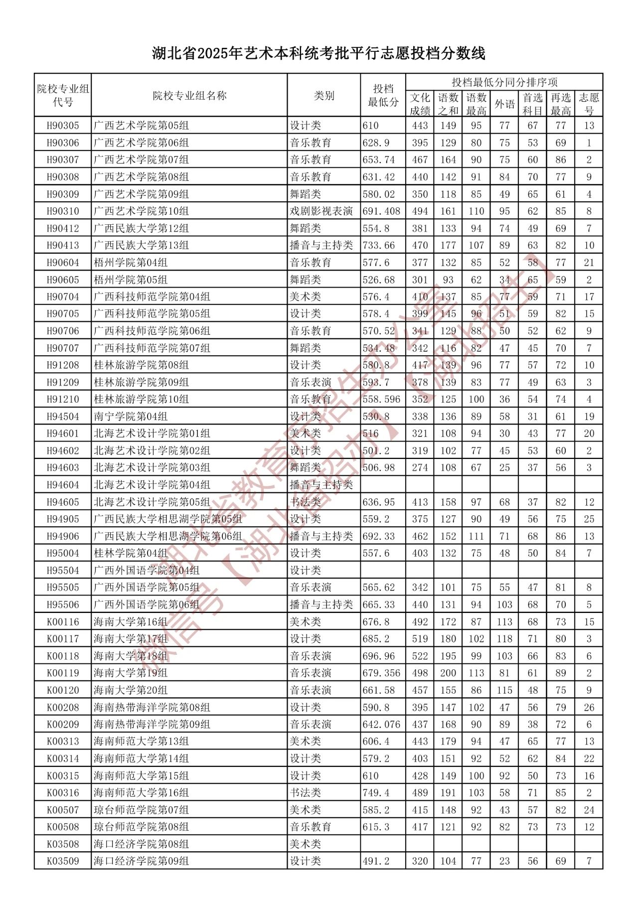 湖北省2025年艺术本科统考批平行志愿投档分数线