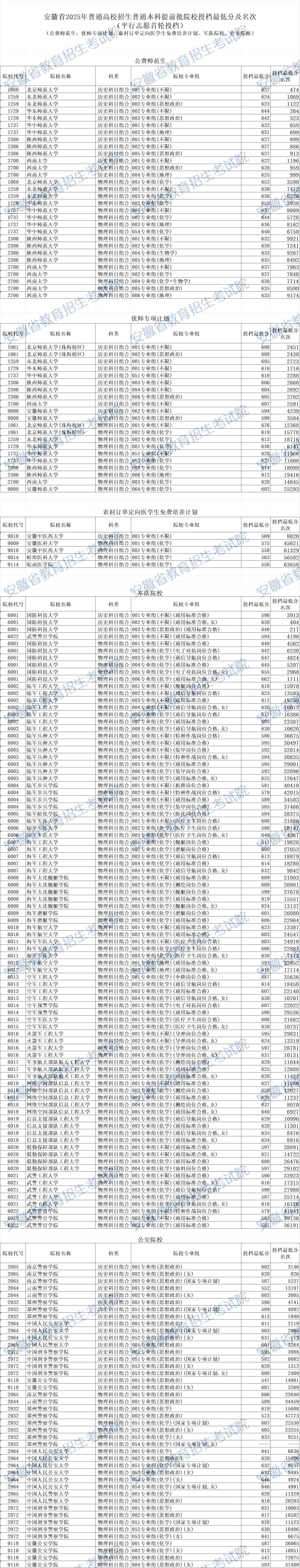 安徽省2025年普通本科提前批院校投档最低分(平行志愿首轮投档)