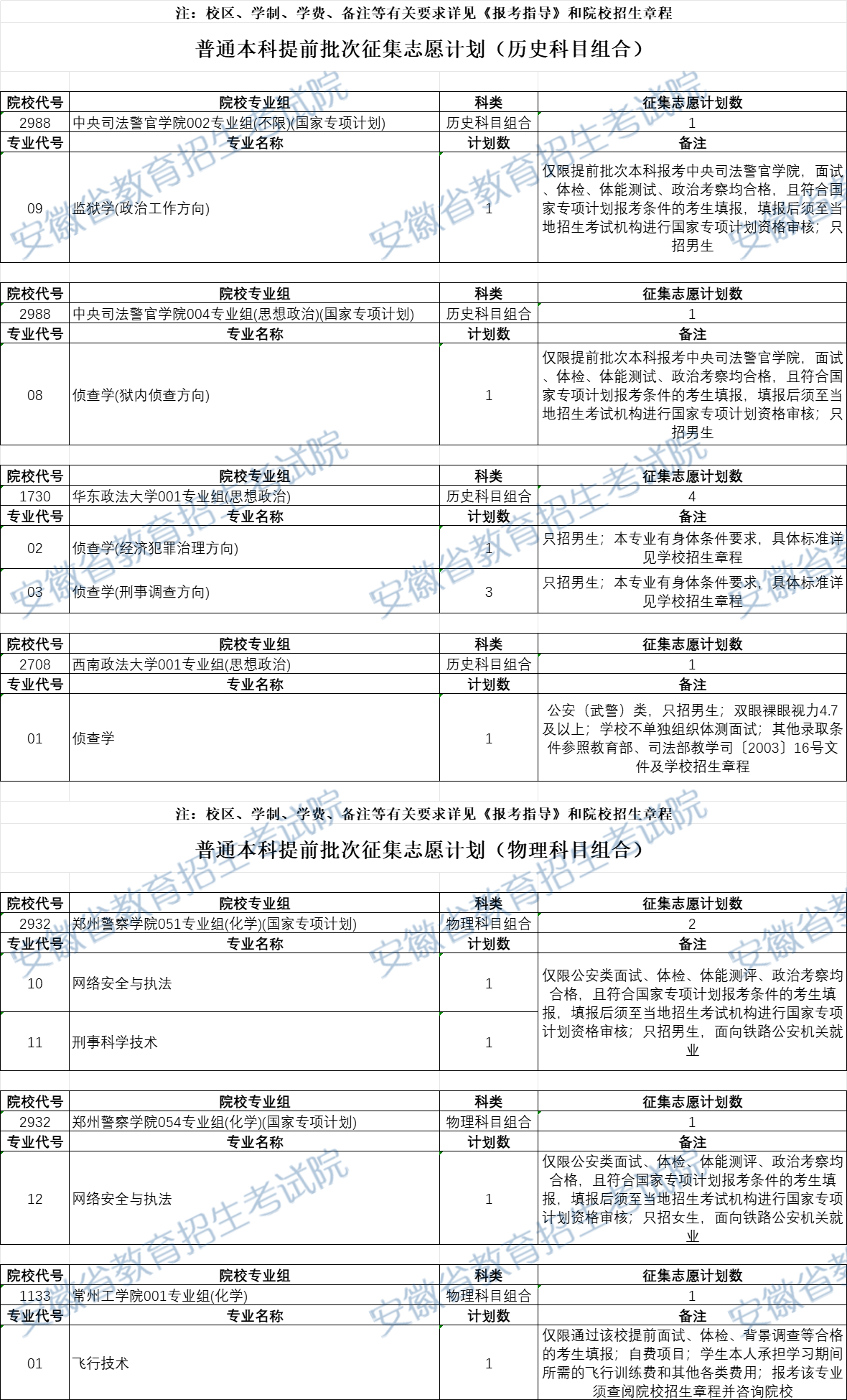 安徽普通本科提前批次征集志愿计划(历史科目组合)、(物理科目组合)已发布,详细信息如下: