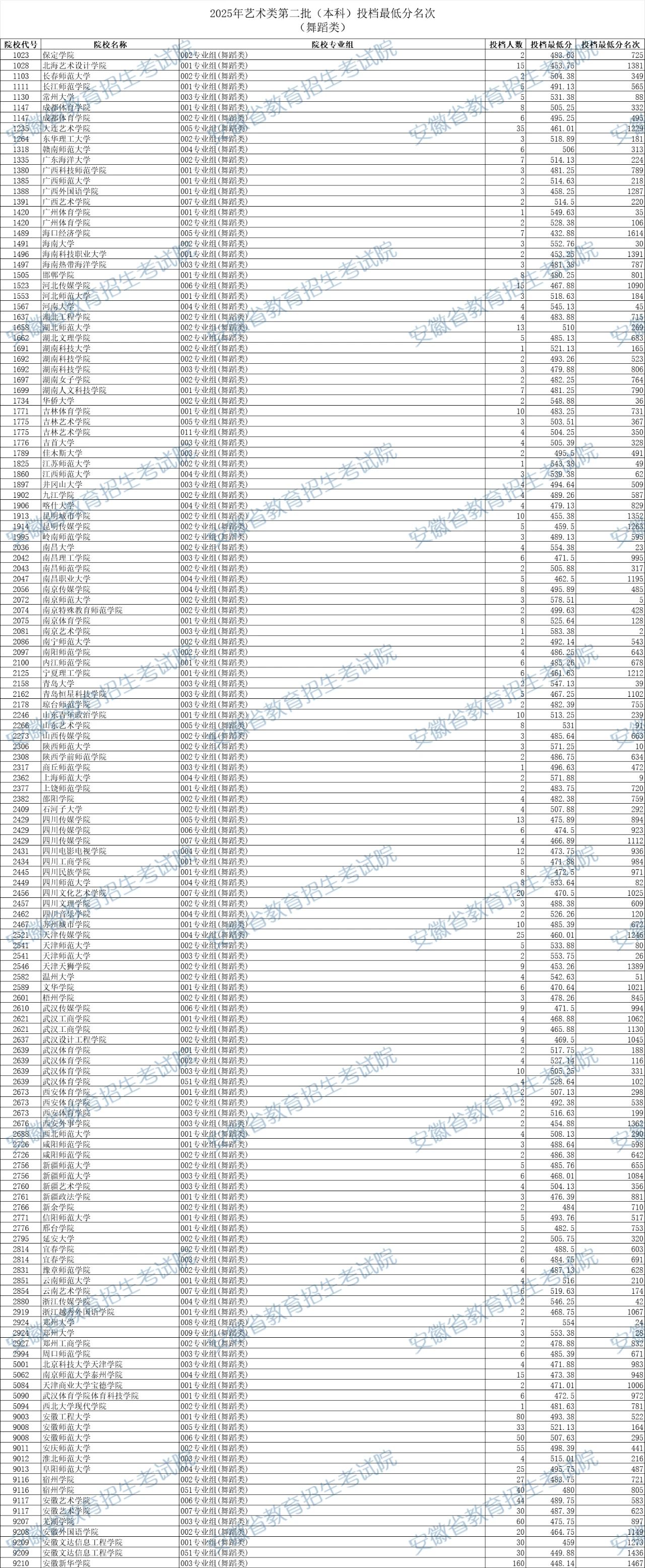 安徽2025年艺术类第二批(本科)投档最低分名次(舞蹈类)