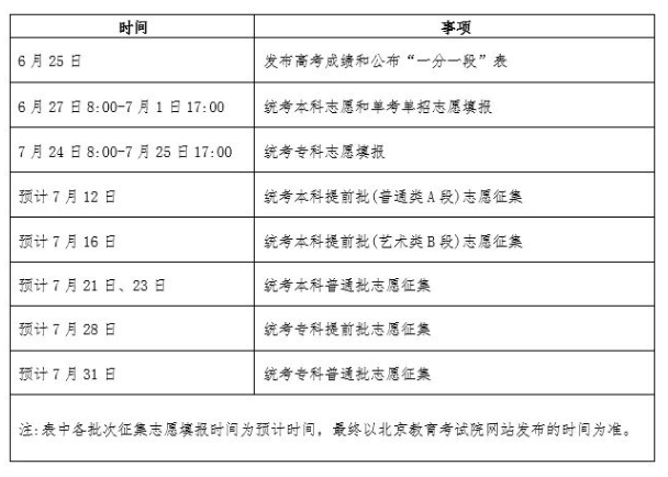 注:表中各批次征集志愿填报时间为预计时间,最终以北京教育考试院网站发布的时间为准。