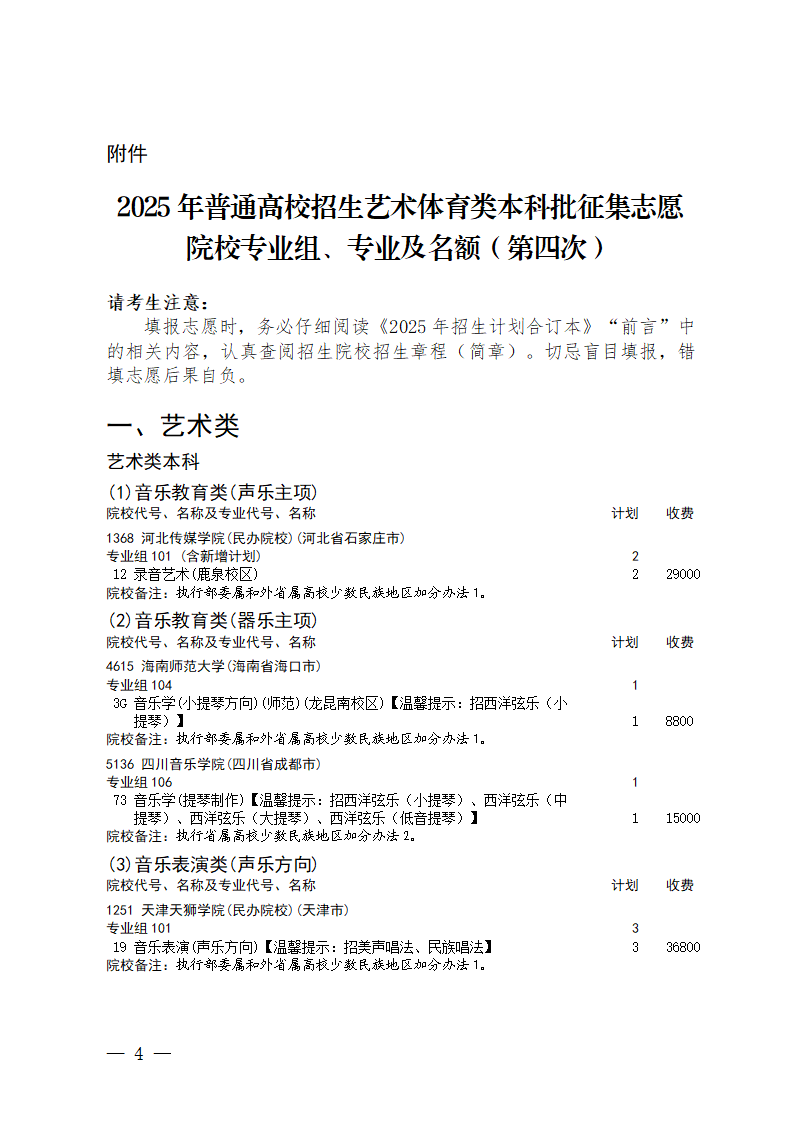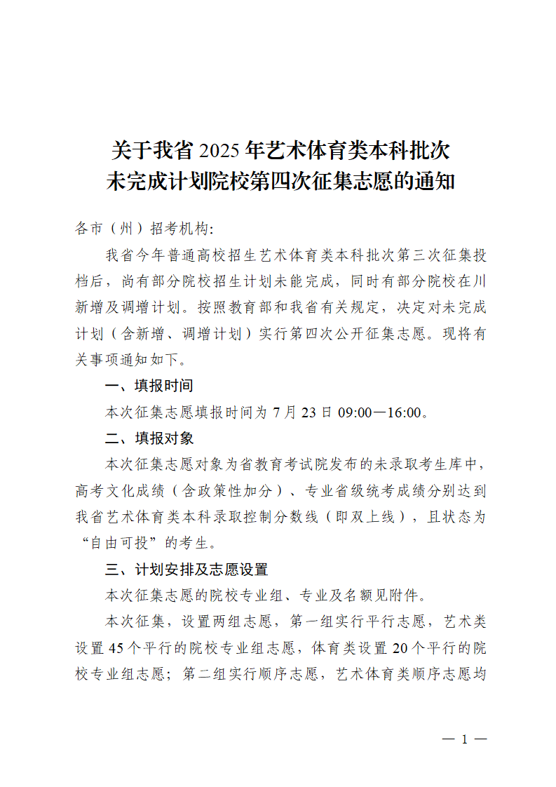 四川省2025年艺术体育类本科批次未完成计划院校第四次征集志愿的通知 时间:2025-07-23 四川 高考新闻 四川省2025年艺术体育类本科批次未完成计划院校第四次征集志愿的通知已发布,具体内容如下: