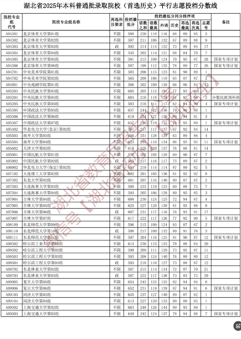 湖北省2025年本科普通批录取院校(首选历史)平行志愿投档分数线如下: