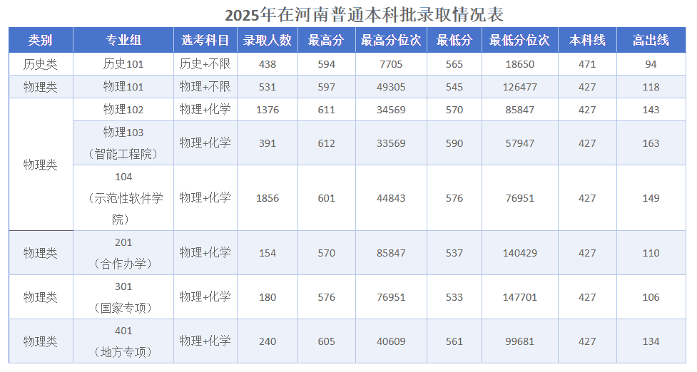 2025年年,学校共设置8个专业组,所有专业组投档分数均远超普通本科线,多个专业组内专业录取分数和位次较往年大幅提升。其中,物理类103组(智能工程学院)录取最高分612.最高分位次33569.最低分590.最低分位次57947.较去年提升6366位;
