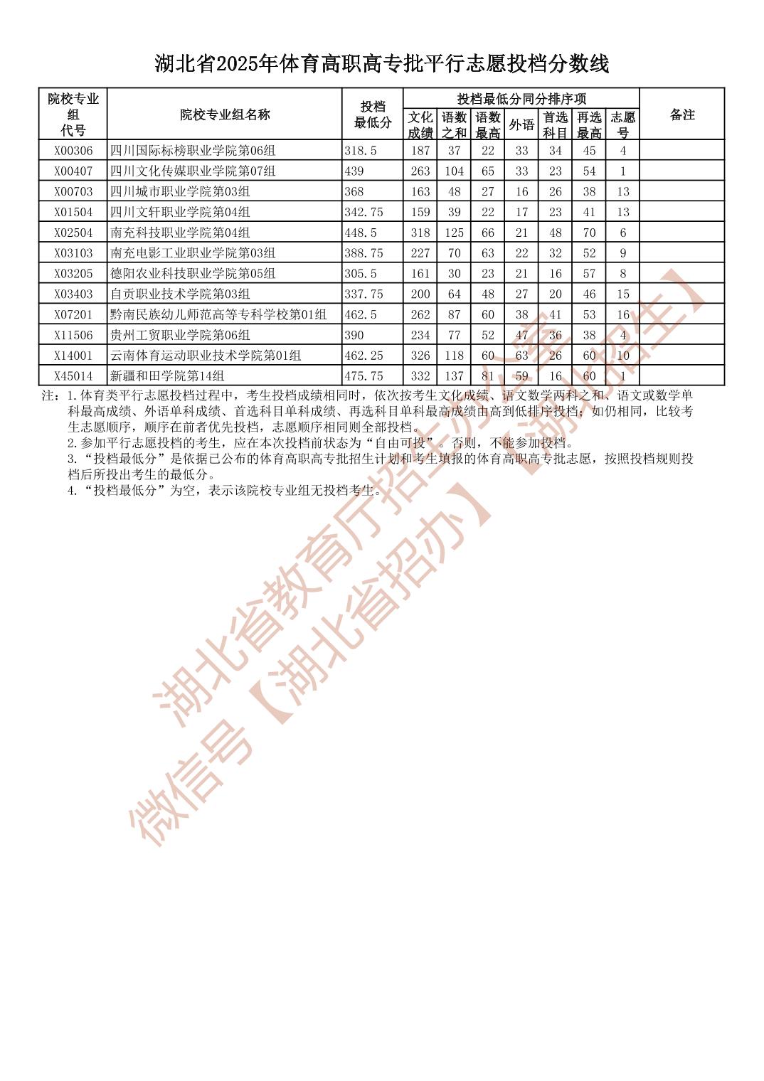 湖北省2025年体育高职高专批平行志愿投档分数线已发布,具体内容如下: