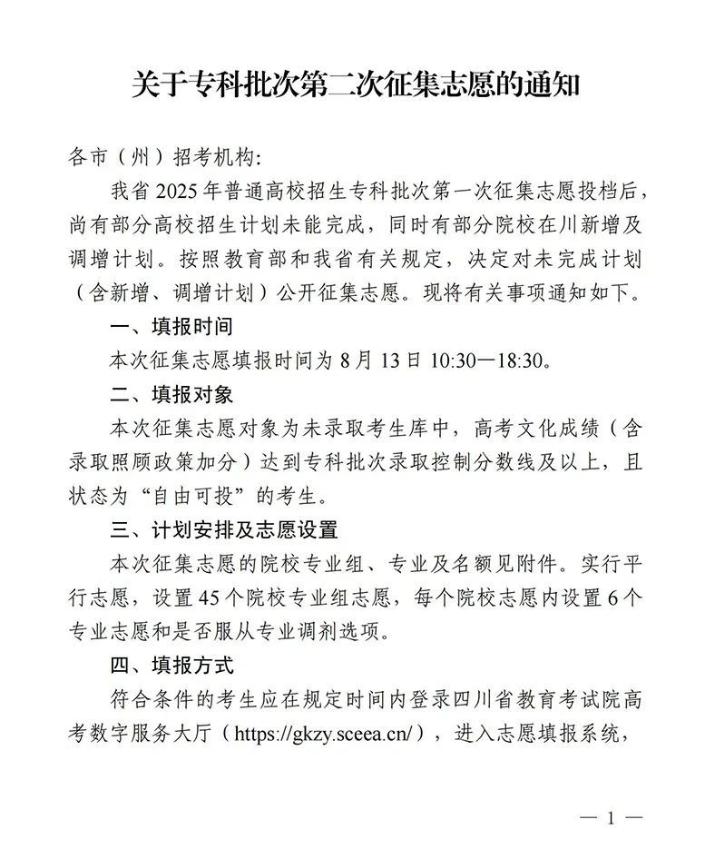 四川关于专科批次第二次征集志愿的通知(含物理类计划) 时间:2025-08-13 四川 高考新闻 四川关于专科批次第二次征集志愿的通知(含物理类计划)已发布,具体内容如下: 附件:2025年普通高校招生专科批次征集志愿院校专业组、专业及名额(第二次)(物理类计划)
