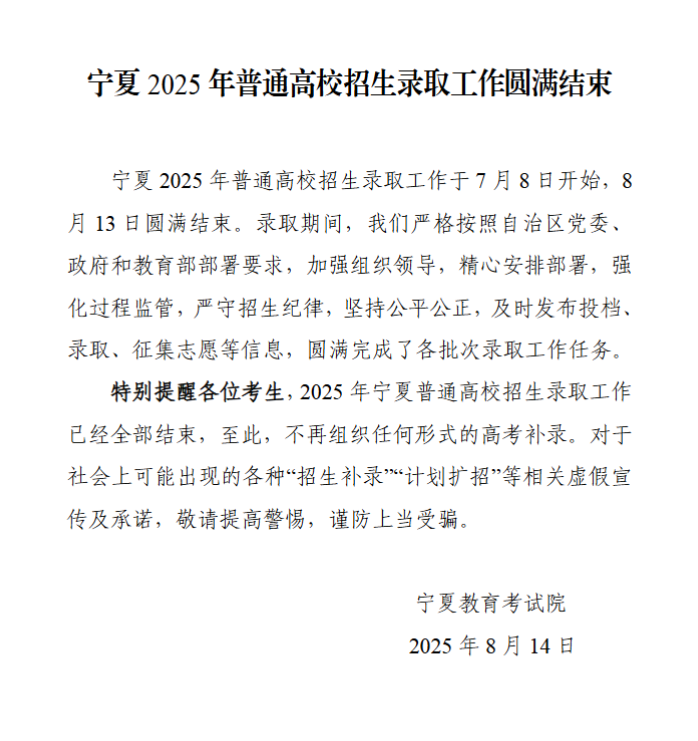 宁夏2025年普通高校招生录取工作圆满结束,具体内容如下: