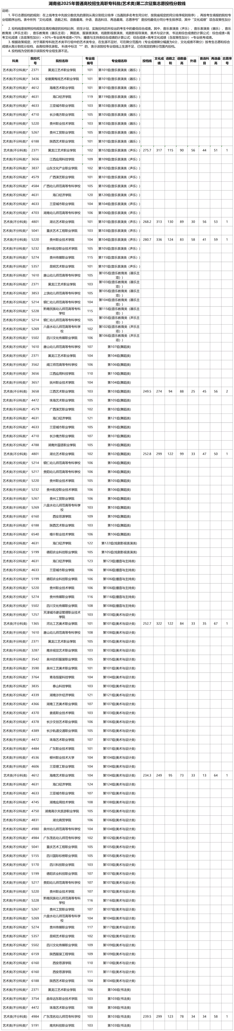 湖南省2025年普通高校招生高职专科批(艺术类)第二次征集志愿投档分数线 时间:2025-08-20 湖南 高考新闻 湖南省2025年普通高校招生高职专科批(艺术类)第二次征集志愿投档分数线已发布,具体内容如下: