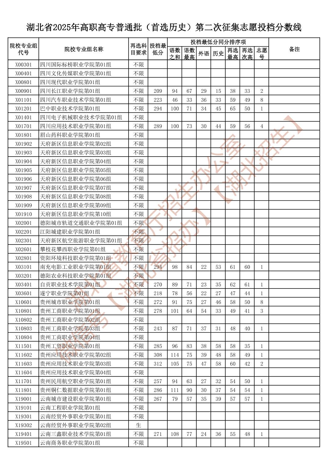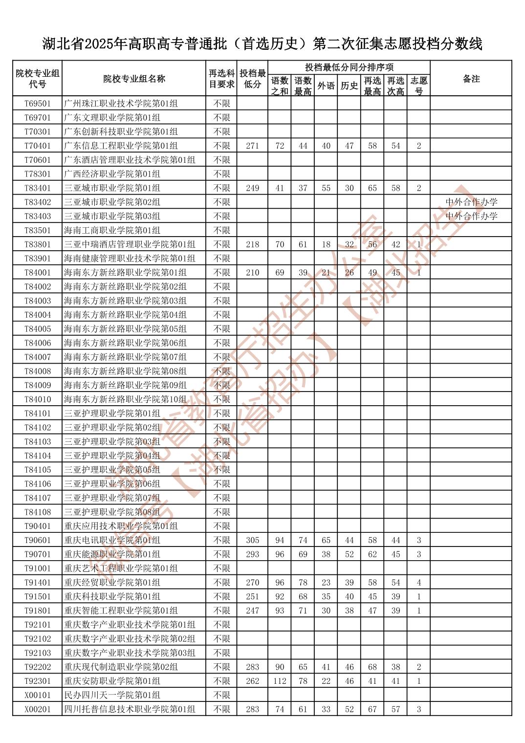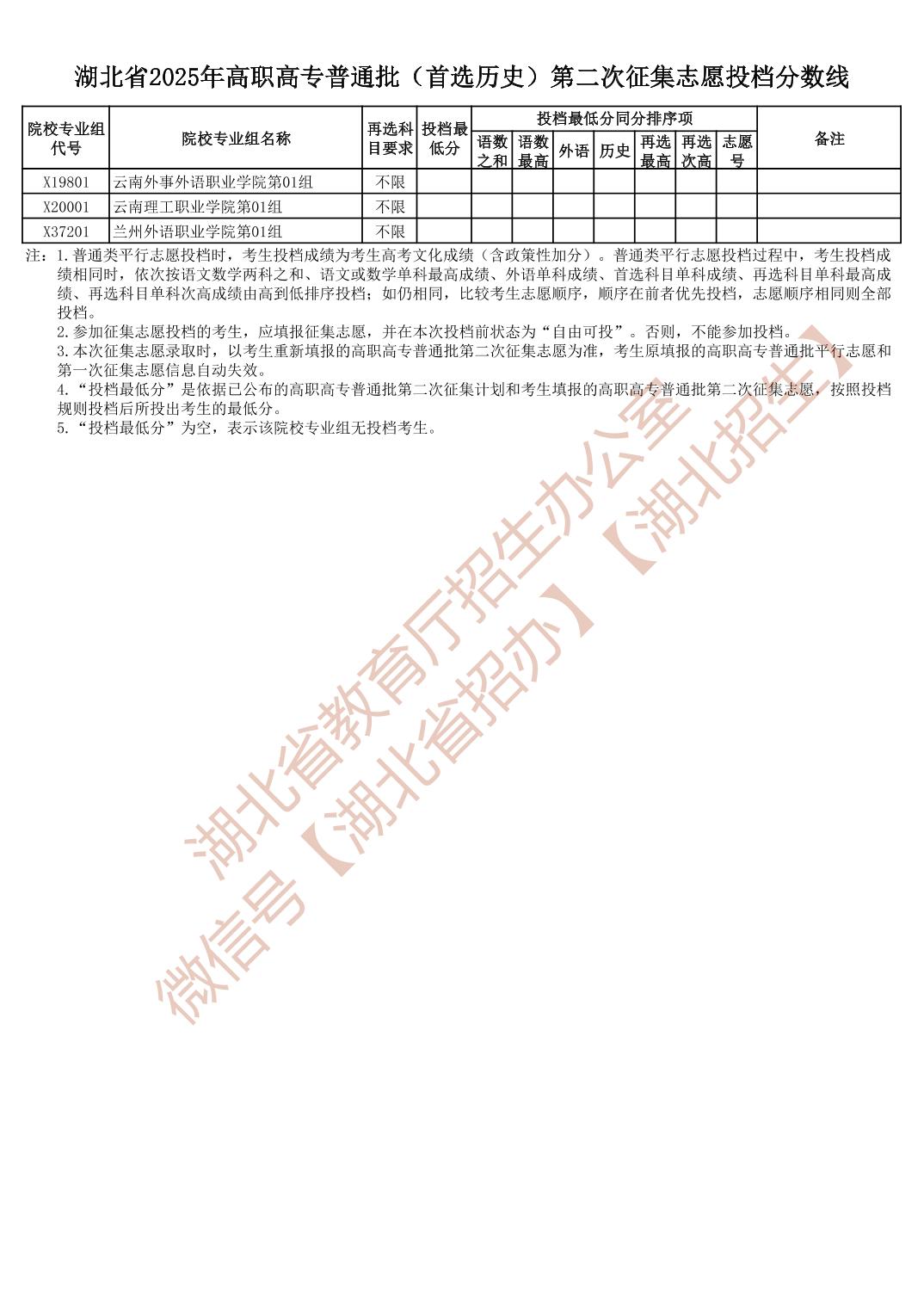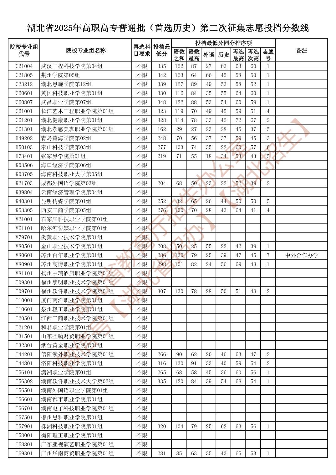 湖北省2025年高职高专普通批(首选历史)第二次征集志愿投档分数线已发布,具体内容如下: