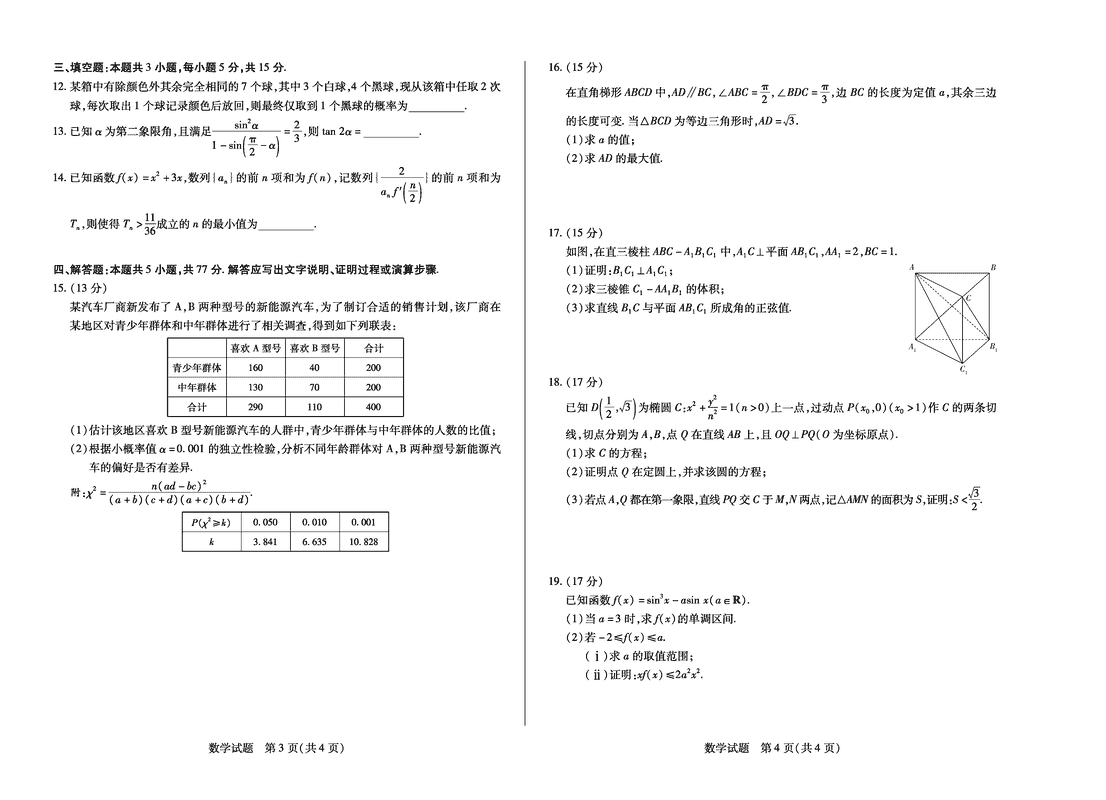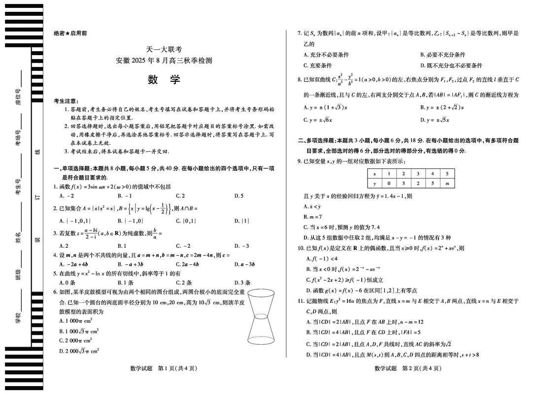 安徽天一大联考2026届高三8月秋季检测数学试题及答案