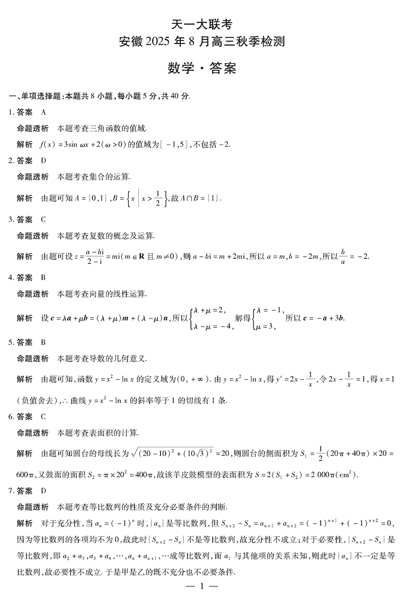安徽省天一大联考2026届高三8月秋季检测数学考试已于近日开考,为方便考生考后及时查看考试情况,查漏补缺、弥补不足,本文整理了试题答案解析相关信息!