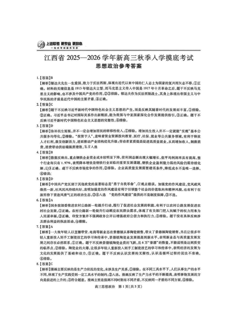 江西省上进联考2025-2026学年新高三秋季入学摸底政治考试已于近日开考,为方便考生考后及时查看考试情况,查漏补缺、弥补不足,本文整理了试题答案解析相关信息!