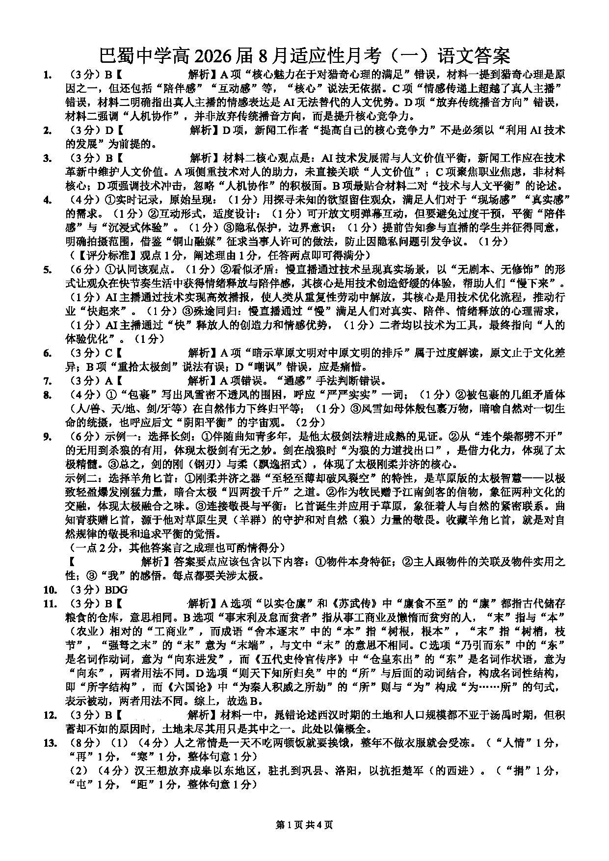 重庆市巴蜀中学2026届高三8月高考适应性月考(一)语文试题及答案