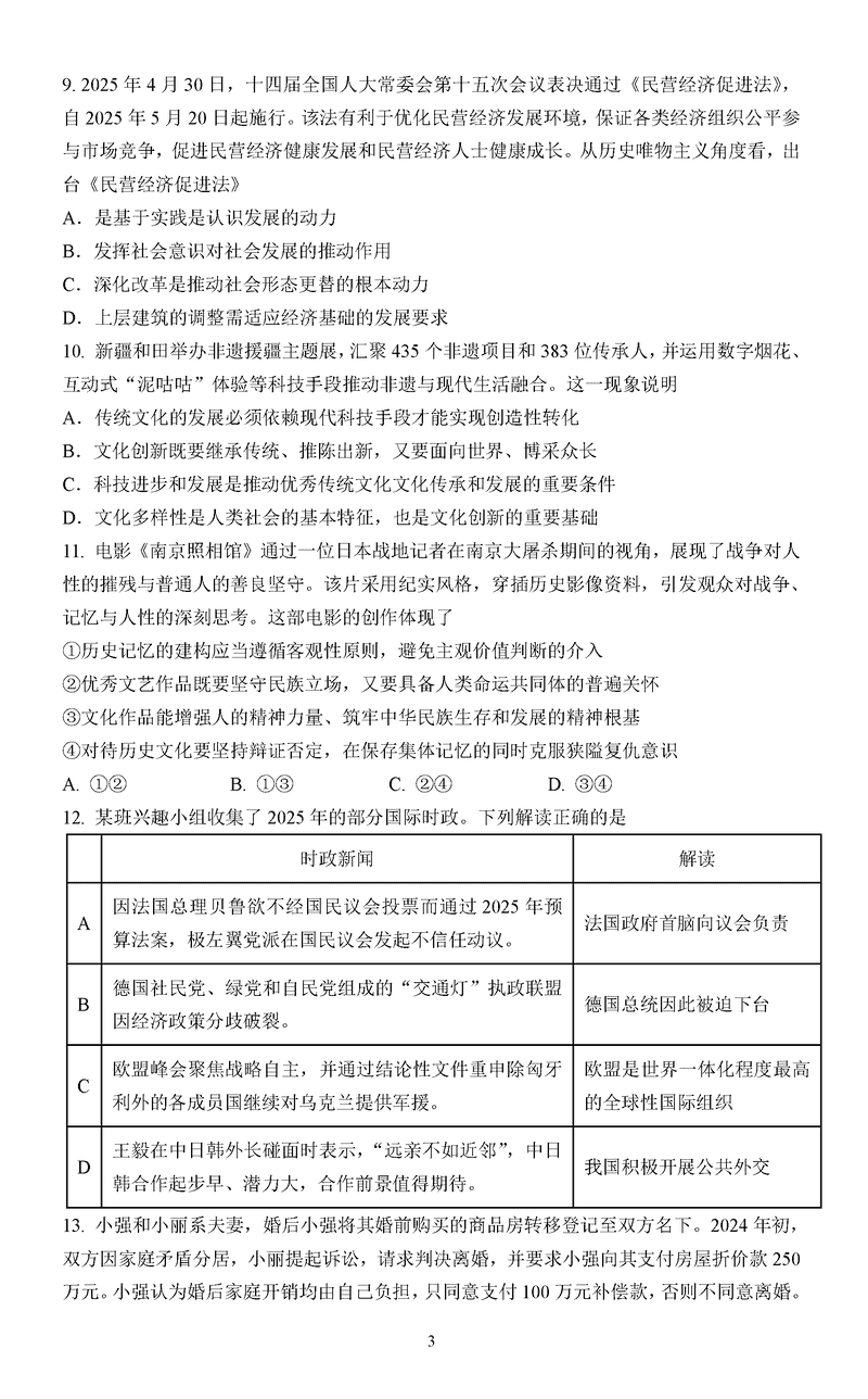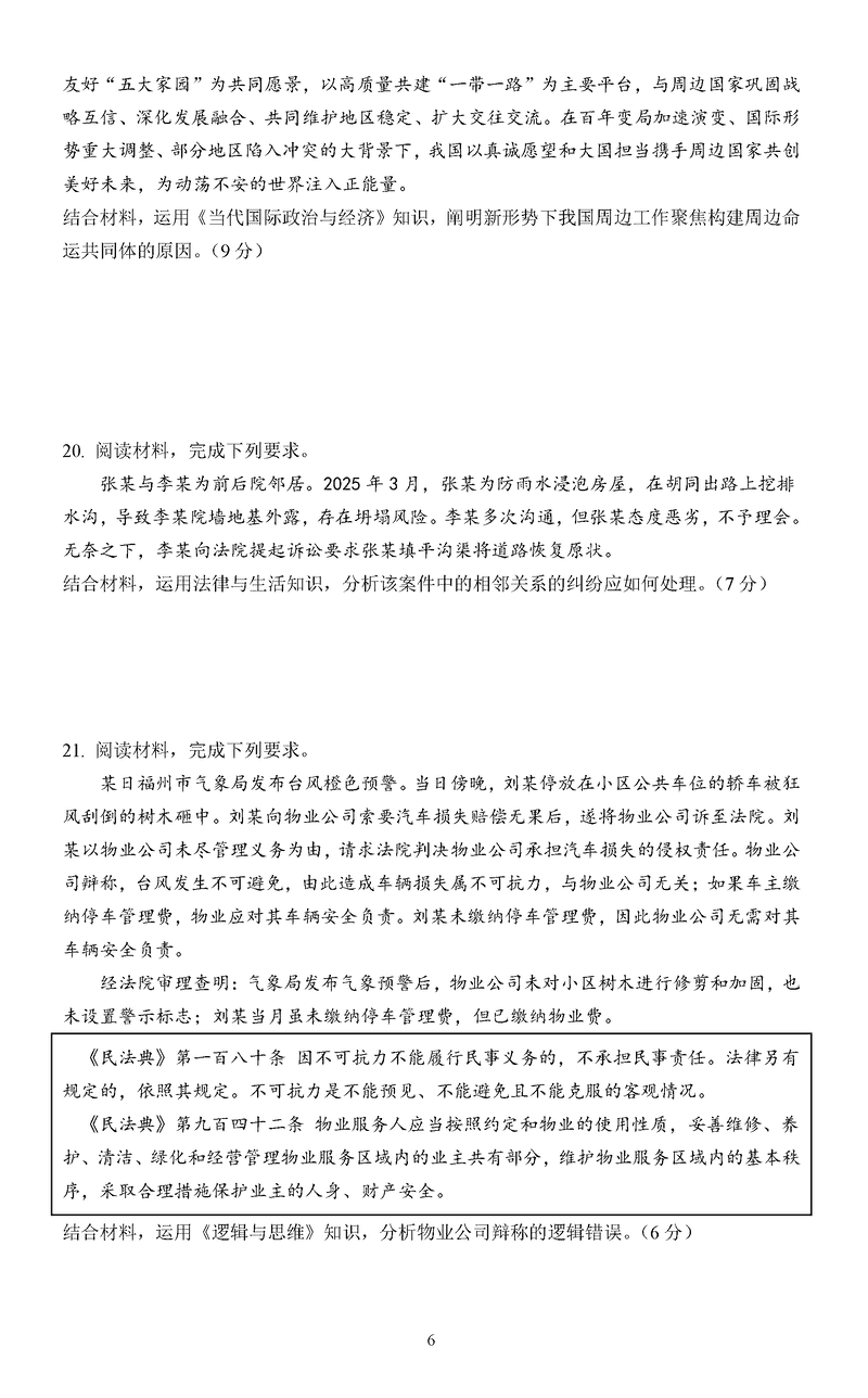 南京市六校联合体2026届高三上学期8月学情调研政治试题及答案