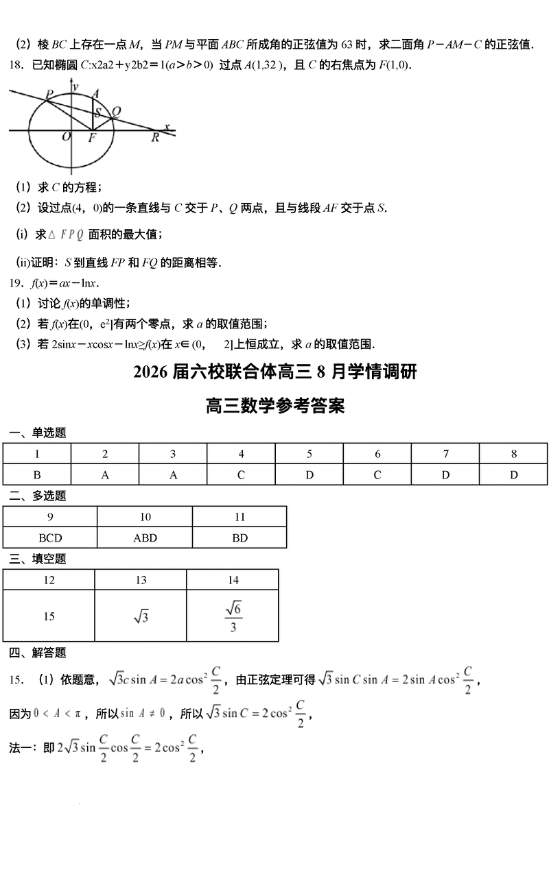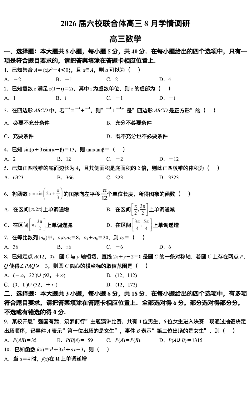 南京市六校联合体2026届高三上学期8月学情调研数学试题及答案