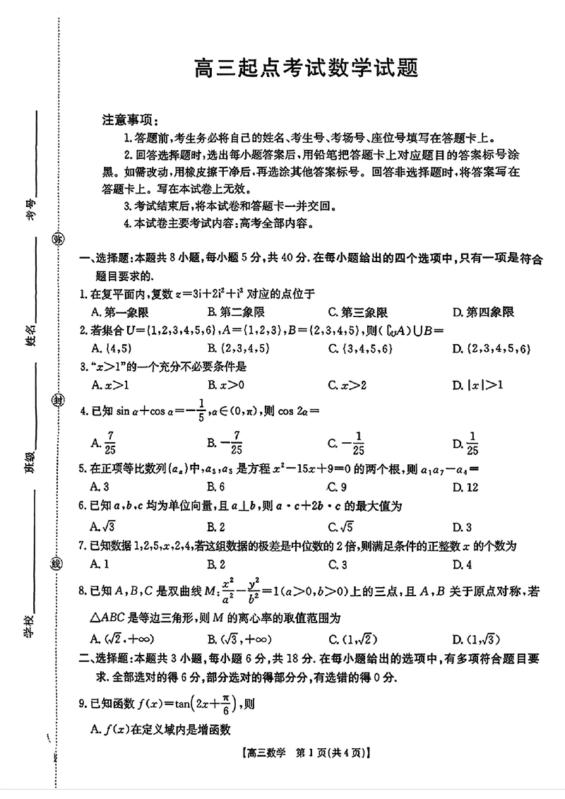 皖西南高中振兴发展联盟2026届高三起点考数学试题及答案
