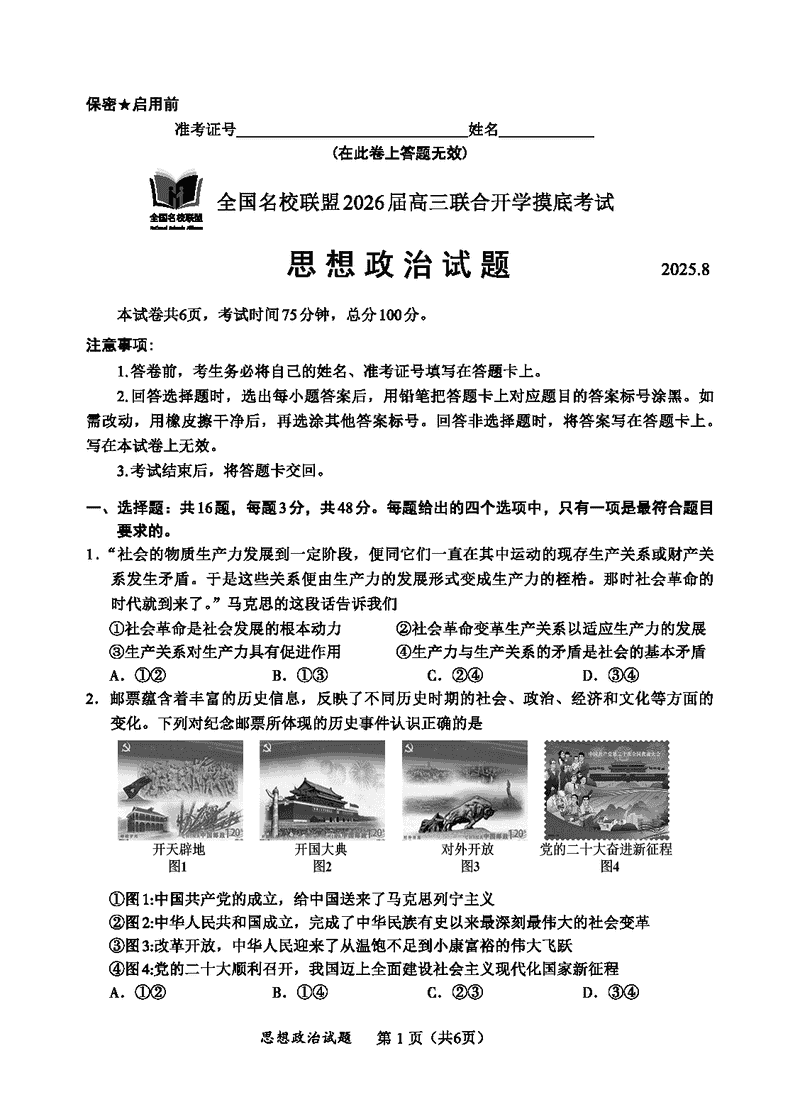 内蒙古-全国名校联盟2026届高三联合开学摸底政治试题及答案
