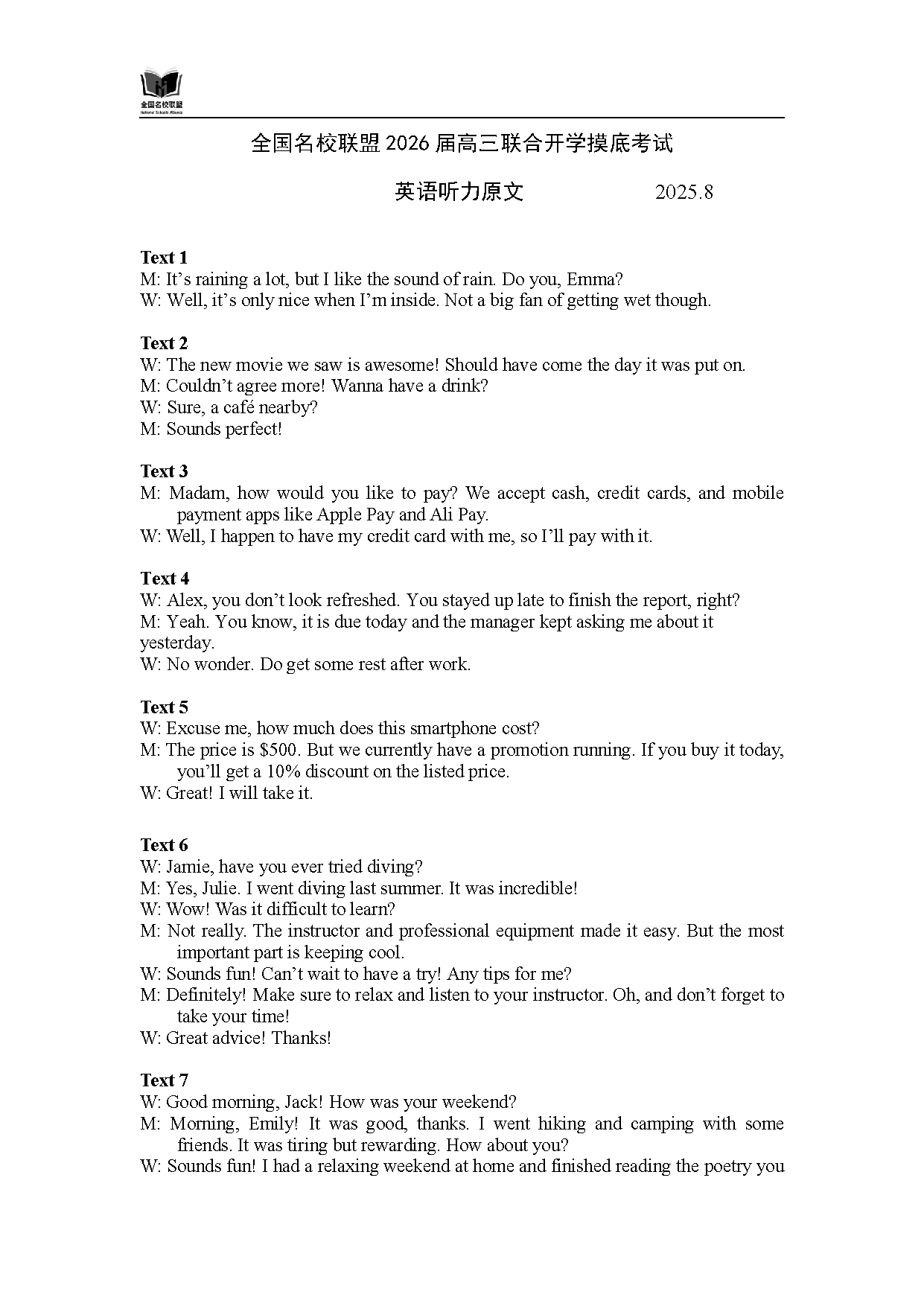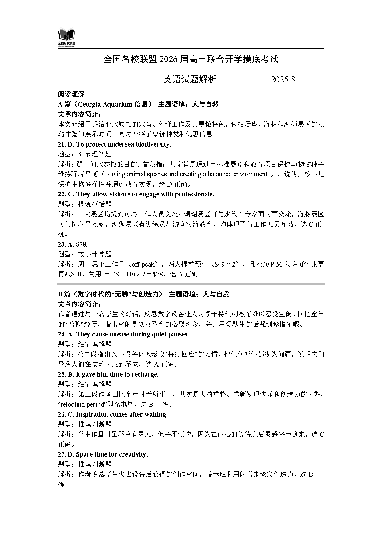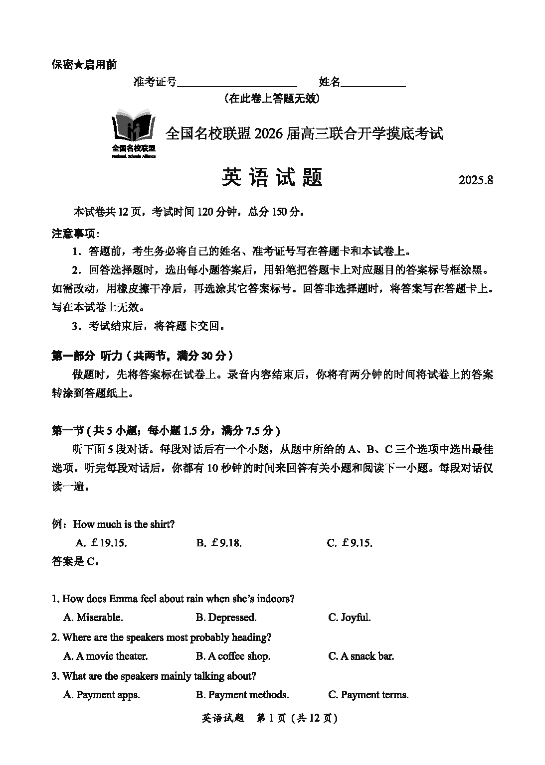 福建-全国名校联盟2026届高三联合开学摸底英语考试已于近日开考,为方便考生考后及时查看考试情况,查漏补缺、弥补不足,本文整理了试题答案解析相关信息!