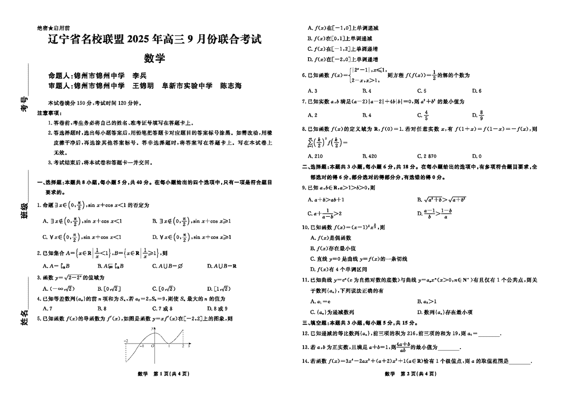 辽宁名校联盟2025年高三9月联考数学试题及答案