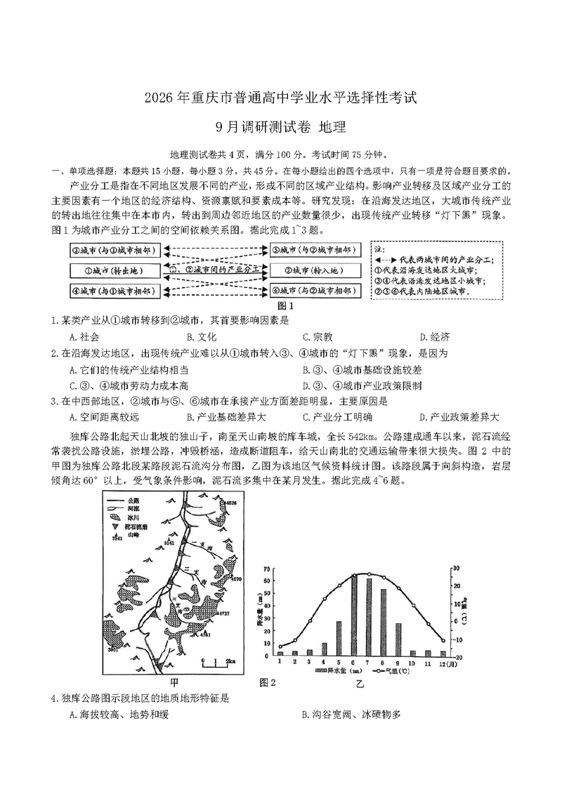 重庆康德卷2026年高三上学期9月调研地理试题及答案