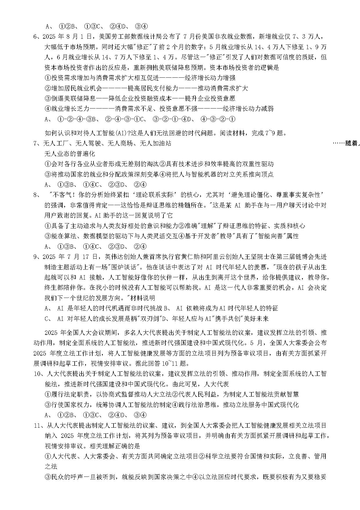 重庆康德卷2026年高三上学期9月调研政治试题及答案