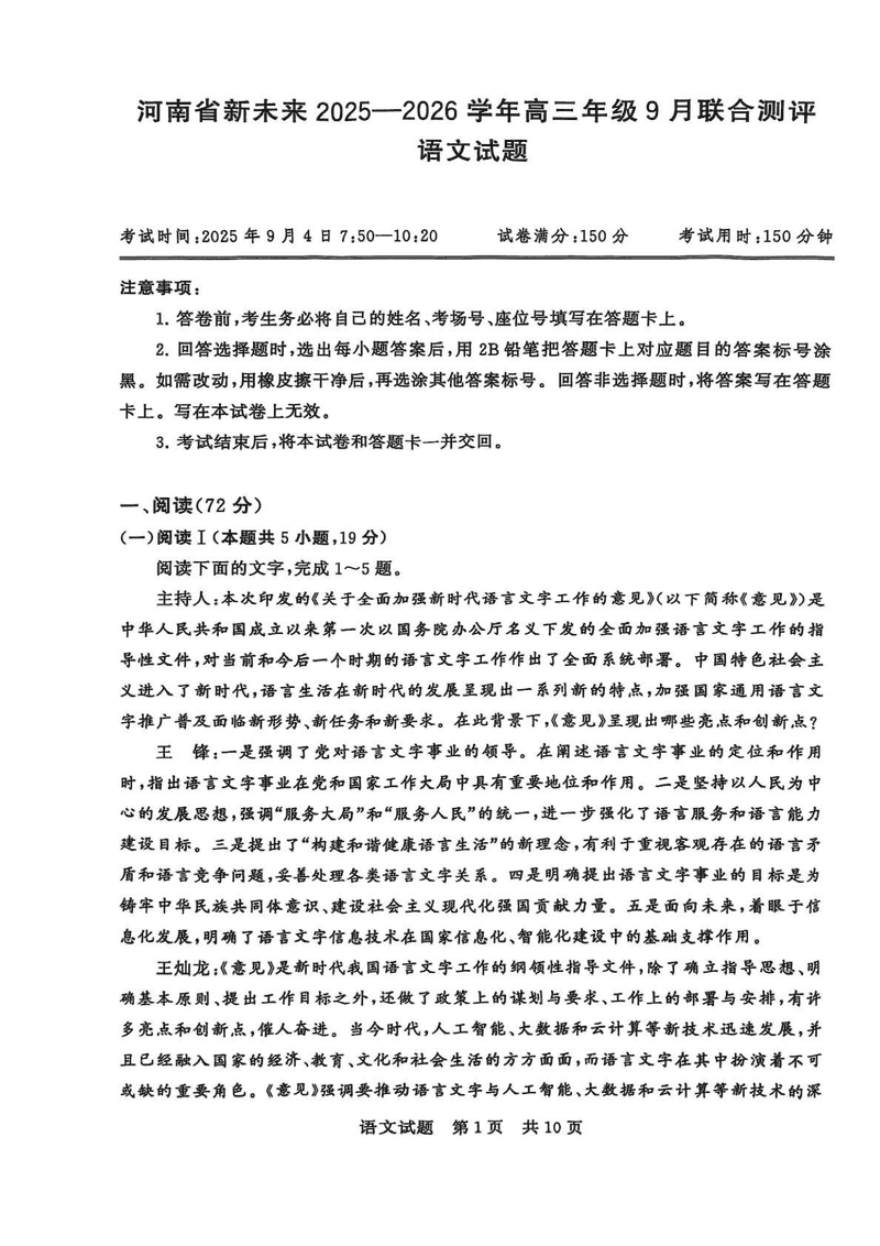 河南新未来2025-2026学年高三上9月联合测评语文试题及答案