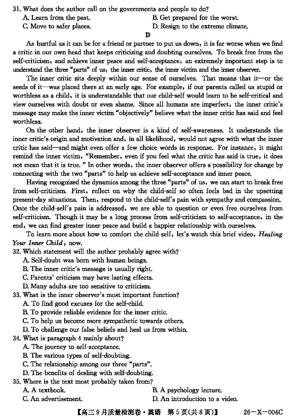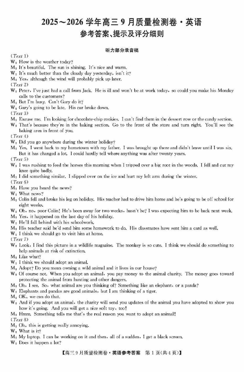 山西三晋卓越联盟2025-2026学年高三9月质检英语试题及答案