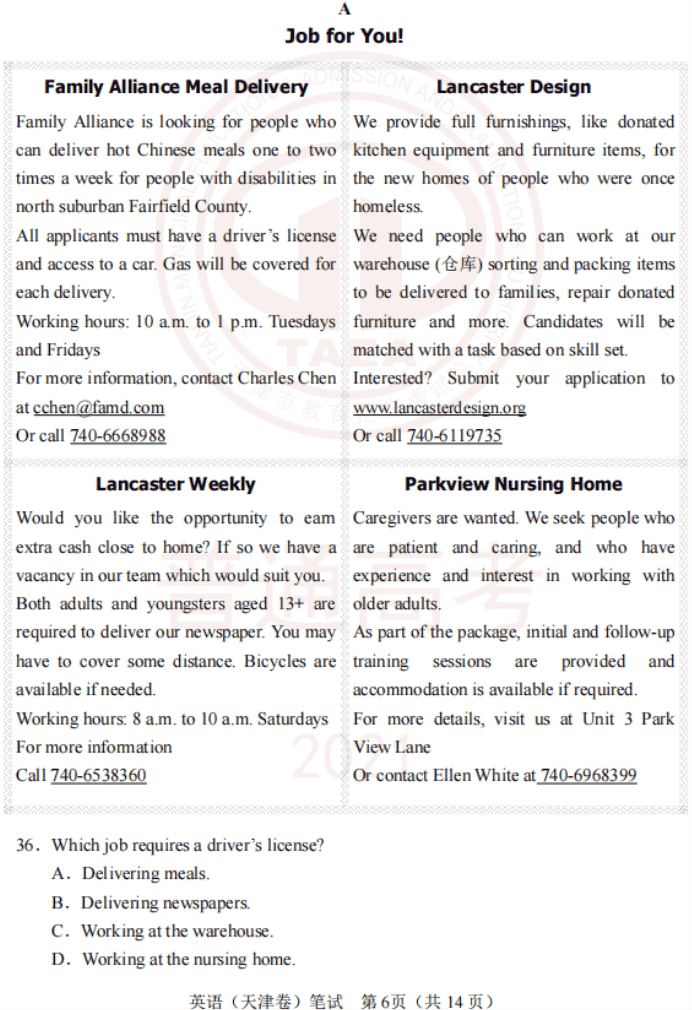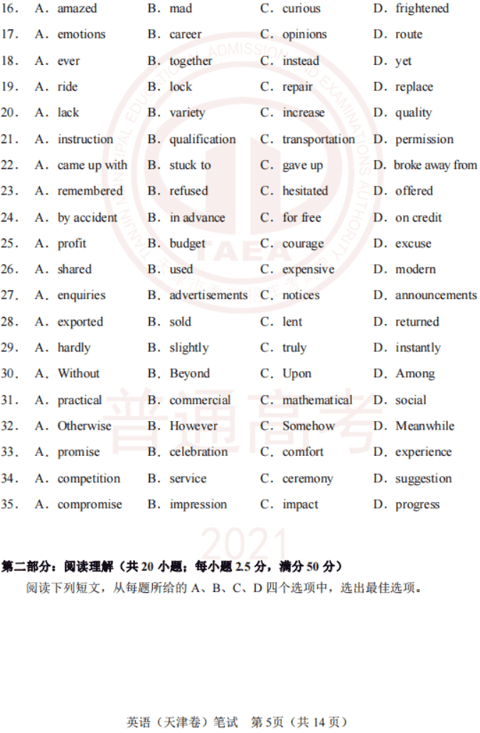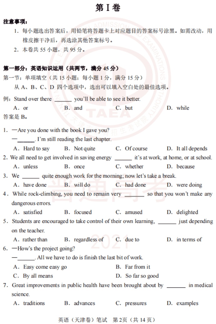 2021年3月高考天津卷英语试卷及参考答案 都有什么题型