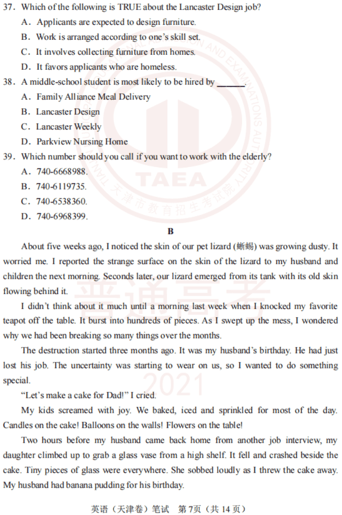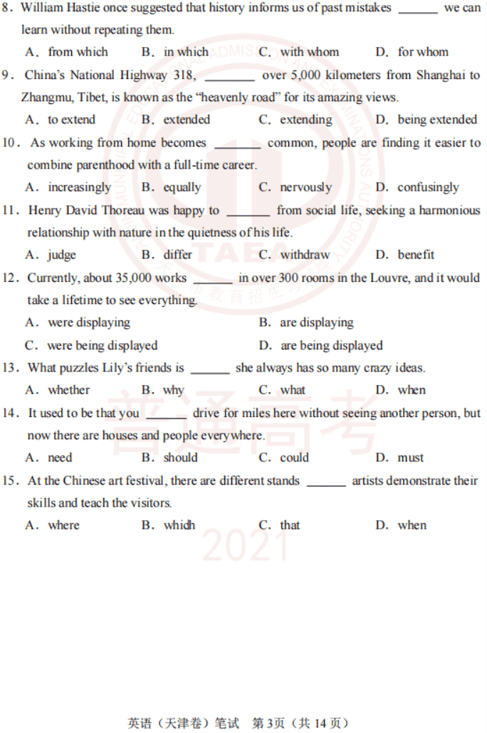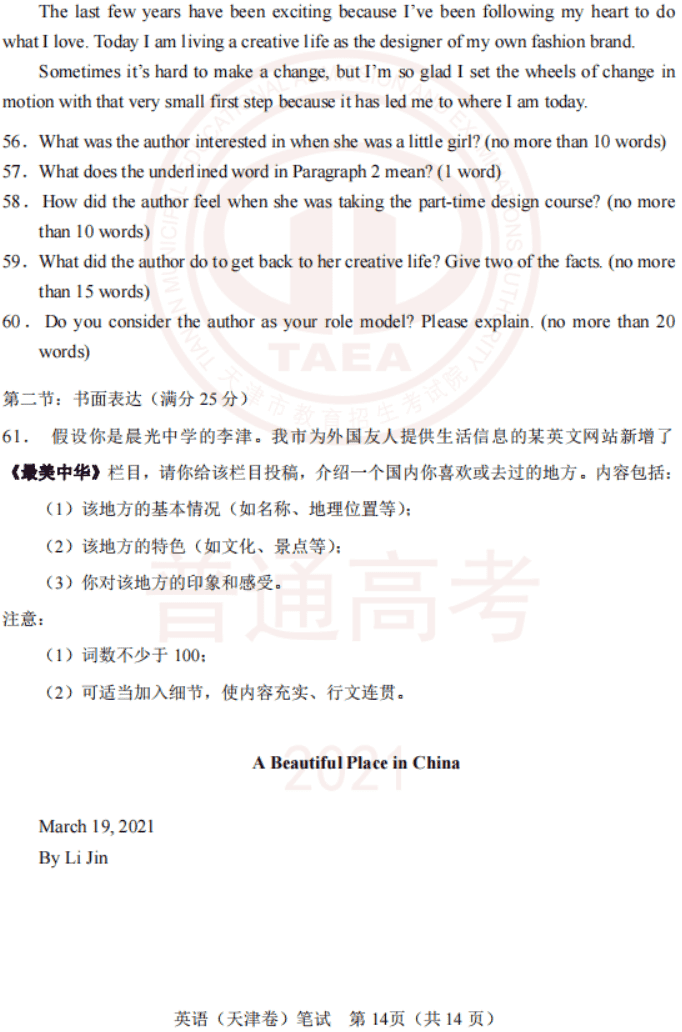 2021年3月高考(天津卷)英语试卷及参考答案