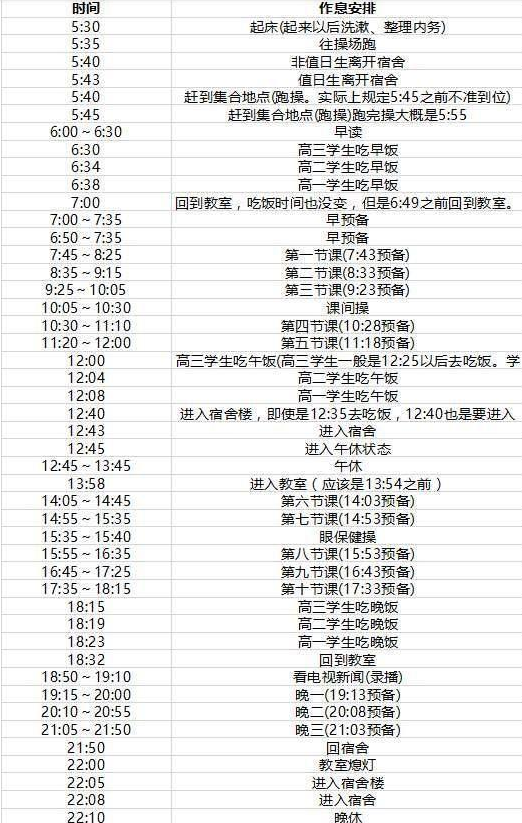 面对繁重的高中学习任务,就不得不付出更多的努力,将更多的时间和精力用在学习上。一般人,在学习的时候都会制定一个每天的学习计划表,以此来督促自己每天的学习。而学校为了让学生更好的学习,也会制定相应的时间作息表。衡水中学之所以成为全国闻名的王牌中学,其时间管理的严格是非常重要的因素,下面是衡水中学的作息时间表,大家感受一下。