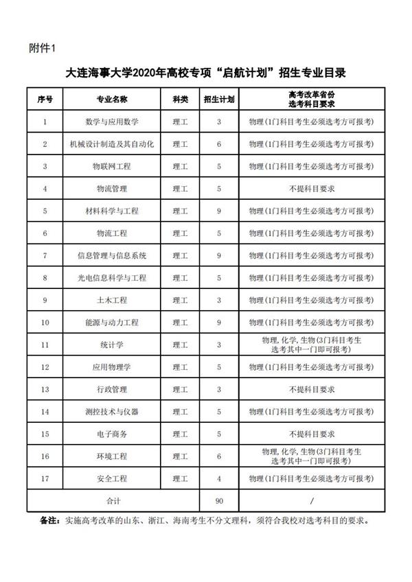 大连海事大学发布了2020年高校专项“启航计划”招生简章,公布了招生计划等相关信息,计划招生90人,招生专业包括物联网工程、物流管理、土木工程等。