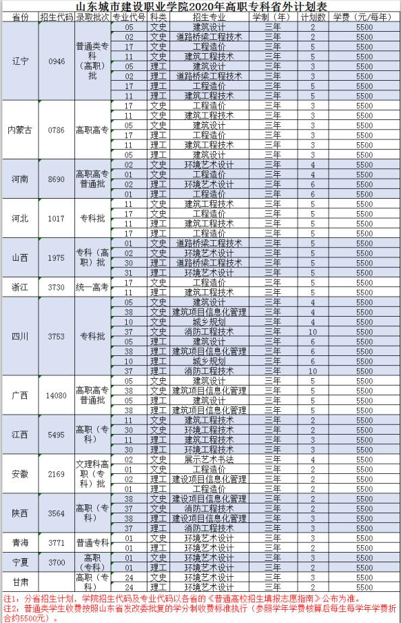 数据来源:山东城市建设职业学院2020年高职专科省外招生计划(http://zs.sduc.edu.cn/info/1088/1270.htm)