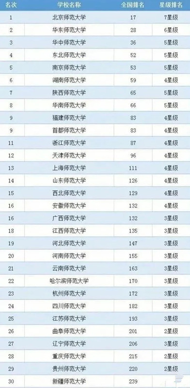 东北师范大学、南京师范大学、湖南师范大学、陕西师范大学、华南师范大学、福建师范大学和首都师范大学定位前十。