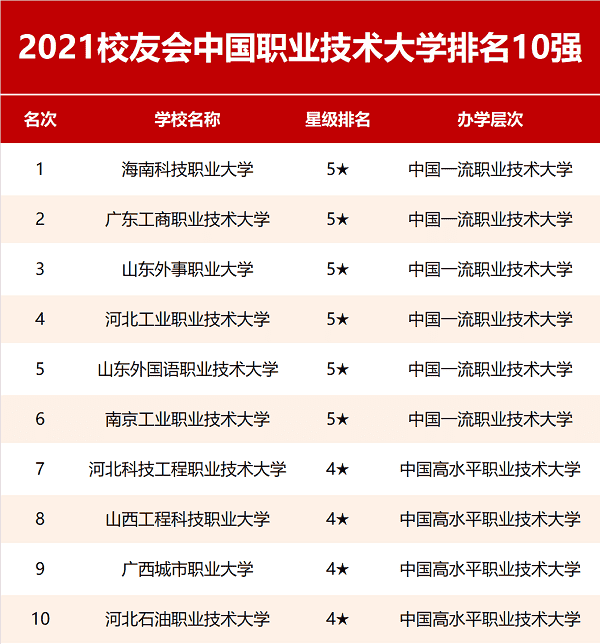 在中国职业技术大学排名中,海南科技职业大学排名第一位,广东工商职业技术大学排名第二位!