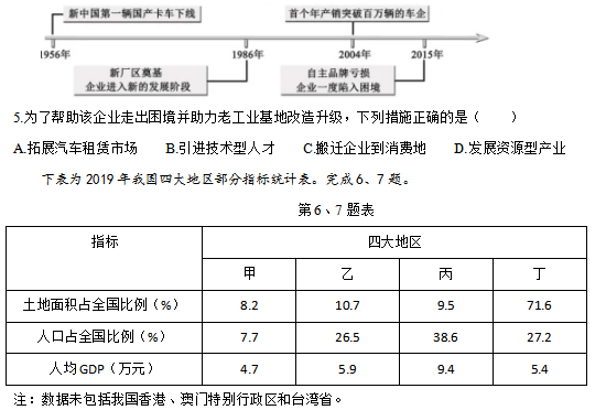 6.甲、乙丙、丁中代表中部地区的是( )